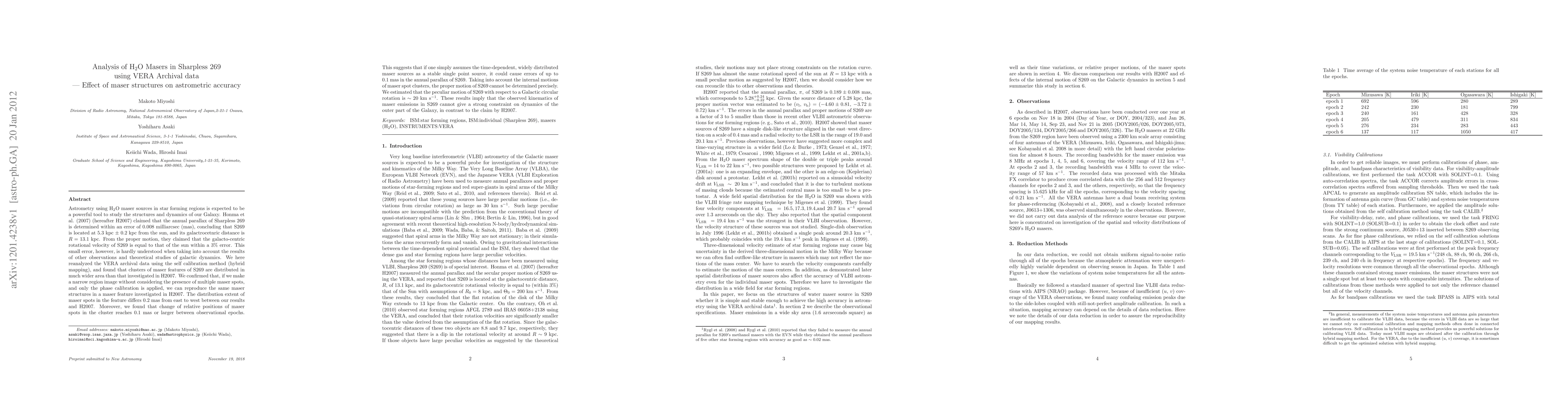 Astrometry using H2O maser sources in star forming regions is expected to be a powerful tool to study the structures and dynamics of our Galaxy. Honma et al. (2007) (hereafter H2007) claimed that the annual parallax of S269 is determined within an error of 0.008 milliarcsec (mas), concluding that S269 is located at 5.3 kpc +- 0.2 kpc from the sun, and R= 13.1 kpc. They claimed that the rotational velocity of S269 is equal to that of the sun within a 3% error. This small error, however, is hardly understood when taking into account the results of other observations and theoretical studies of galactic dynamics. We here reanalyzed the VERA archival data using the self-calibration method (hybrid mapping), and found that clusters of maser features of S269 are distributed in much wider area than that investigated in H2007. We confirmed that, if we make a narrow region image without considering the presence of multiple maser spots, and only the phase calibration is applied, we can reproduce the same maser structures in H2007. The distribution extent of maser spots in the feature differs 0.2 mas from east to west between our results and H2007. Moreover, we found that change of relative positions of maser spots in the cluster reaches 0.1 mas or larger between observational epochs. This suggests that if one simply assumes the time-dependent, widely distributed maser sources as a stable single point source, it could cause errors of up to 0.1 mas in the annual parallax of S269. Taking into account the internal motions of maser spot clusters, the proper motion of S269 cannot be determined precisely. We estimated that the peculiar motion of S269 with respect to a Galactic circular rotation is ~20 km/s. These results imply that the observed kinematics of maser emissions in S269 cannot give a strong constraint on dynamics of the outer part of the Galaxy, in contrast to the claim by H2007.
