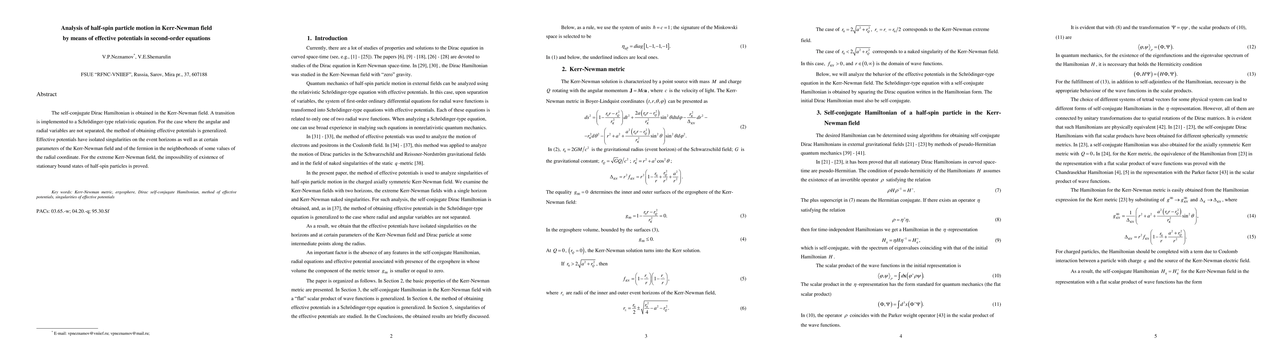 This paper analyzes the motion of half-spin particles in a Kerr-Newman field using effective potentials derived from a generalized Schrödinger-type relativistic equation. It demonstrates the impossibility of stationary bound states for half-spin particles in the extreme Kerr-Newman field.