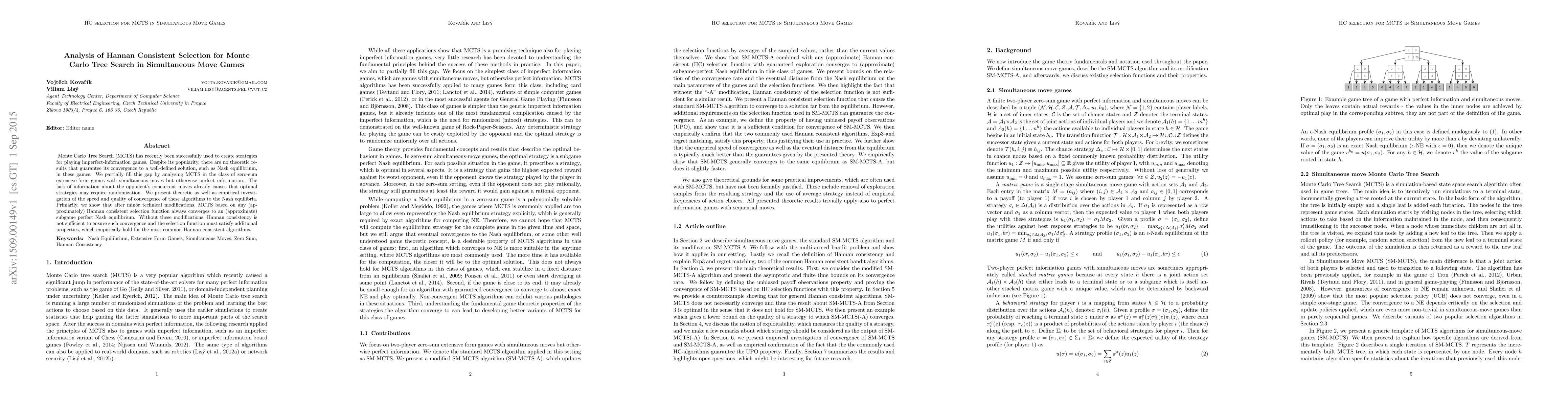 Monte Carlo Tree Search (MCTS) converges to a Nash equilibrium in simultaneous move games with perfect information, but requires modifications for Hannan consistent selection functions. MCTS can achieve subgame perfect Nash equilibria under certain conditions.