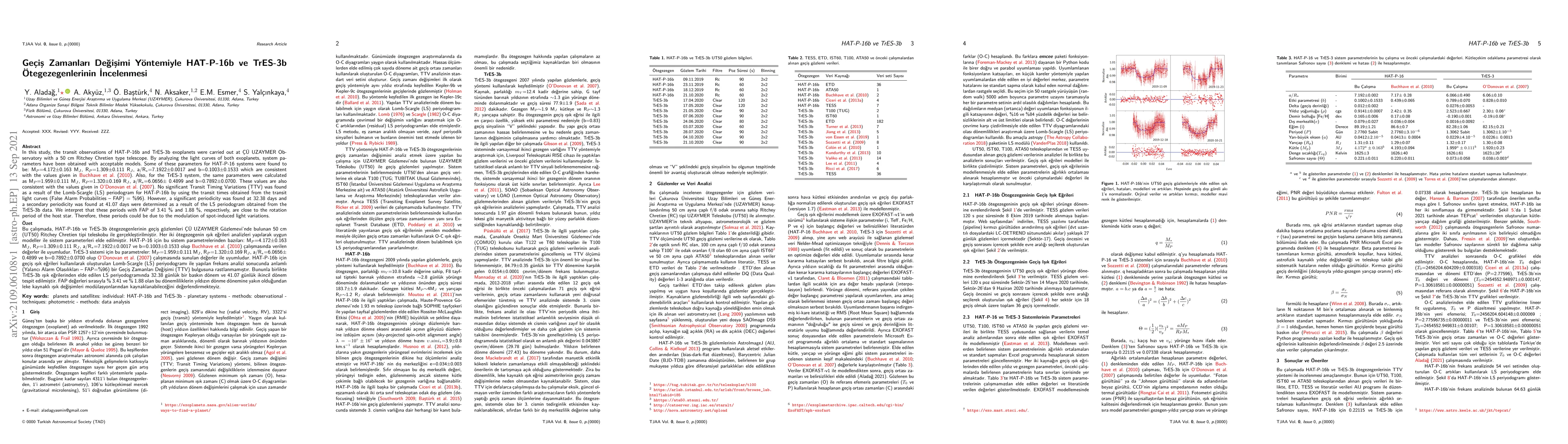 In this study, the transit observations of HAT-P-16b and TrES-3b exoplanets were carried out at \c{C}\"U UZAYMER Observatory with a 50 cm Ritchey Chretien type telescope. By analyzing the light curves of both exoplanets, system parameters have been obtained with acceptable models. Some of these parameters for HAT-P-16 systems were found to be: M$_{P}$=4.172$\pm$0.163 M$_{J}$, R$_{P}$=1.309$\pm$0.111 R$_{J}$, a/R$_{*}$=7.1922$\pm$0.0017 and b=0.1003$\pm$0.1533 which are consistent with the values given in \cite{2010ApJ...720.1118B}. Also, for the TrES-3 system, the same parameters were calculated as M$_{P}$=1.959$\pm$0.111 M$_{J}$, R$_{P}$=1.320$\pm$0.169 R$_{J}$, a/R$_{*}$=6.0656$\pm$ 0.4899 and b=0.7892$\pm$0.0700. These values are also consistent with the values given in \cite{2007ApJ...663L..37O}. No significant Transit Timing Variations (TTV) was found as a result of the Lomb-Scargle (LS) periodogram for HAT-P-16b by using the transit times obtained from the transit light curves (False Alarm Probabilities -- FAP) = \%96). However, a significant periodicity was found at 32.38 days and a secondary periodicity was found at 41.07 days were determined as a result of the LS periodogram obtained from the TrES-3b data. We interpret that these periods with FAP of 3.41 \% and 1.88 \%, respectively, are close to the rotation period of the host star. Therefore, these periods could be due to the modulation of spot-induced light variations.