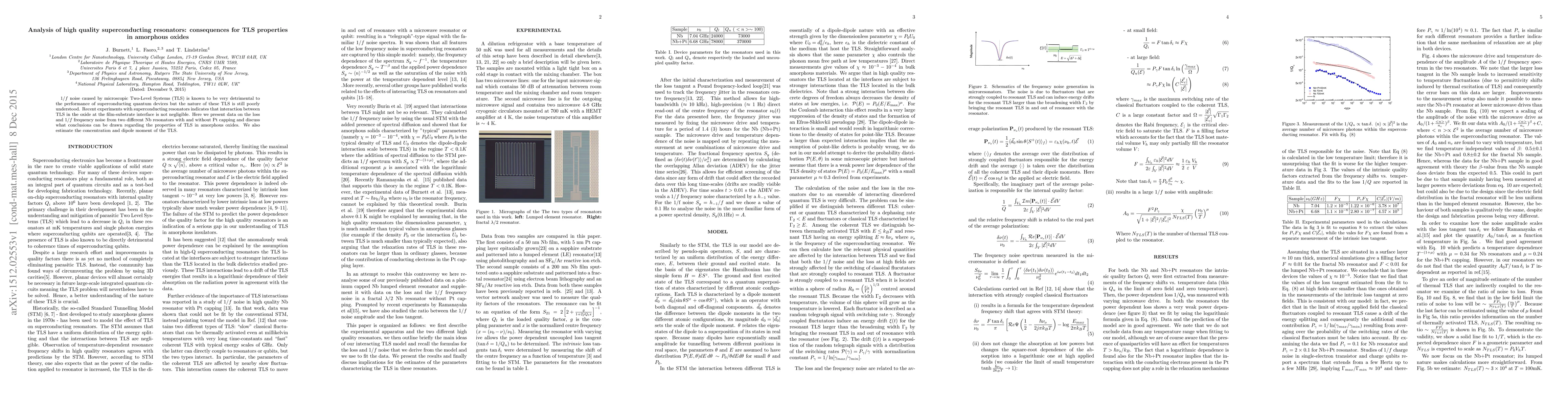 This paper analyzes high-quality superconducting resonators to investigate the impact of Two-Level Systems (TLS) in amorphous oxides, revealing that interface interactions significantly affect TLS properties. The study estimates TLS concentration and dipole moments, providing insights into $1/f$ noise detrimental to quantum devices.