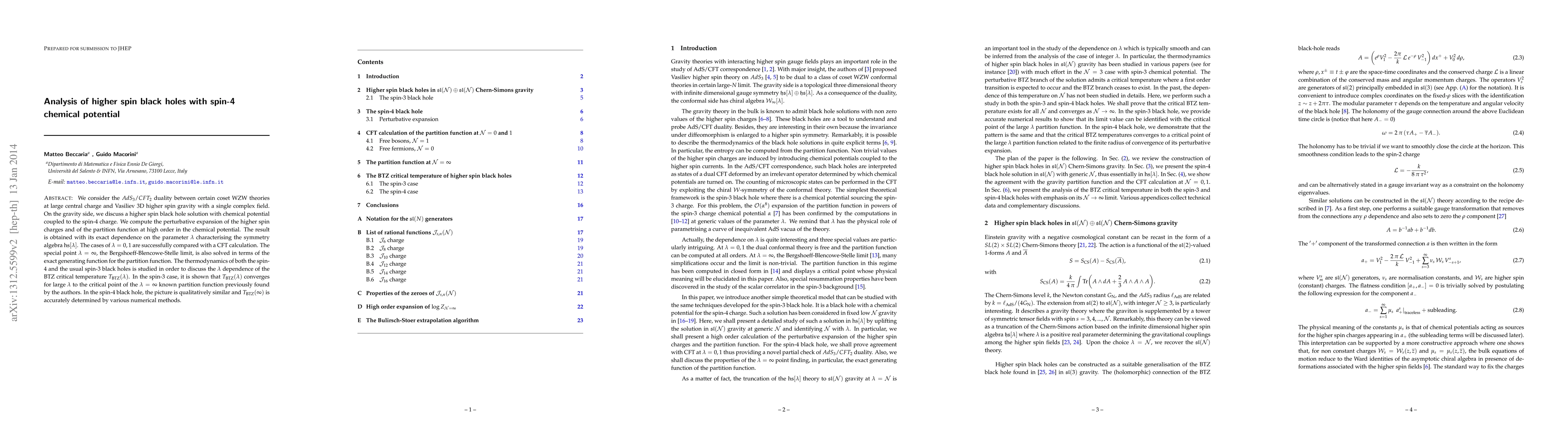 We consider the $AdS_{3}/CFT_{2}$ duality between certain coset WZW theories at large central charge and Vasiliev 3D higher spin gravity with a single complex field. On the gravity side, we discuss a higher spin black hole solution with chemical potential coupled to the spin-4 charge. We compute the perturbative expansion of the higher spin charges and of the partition function at high order in the chemical potential. The result is obtained with its exact dependence on the parameter $\lambda$ characterising the symmetry algebra $\mbox{hs}[\lambda]$. The cases of $\lambda=0,1$ are successfully compared with a CFT calculation. The special point $\lambda=\infty$, the Bergshoeff-Blencowe-Stelle limit, is also solved in terms of the exact generating function for the partition function. The thermodynamics of both the spin-4 and the usual spin-3 black holes is studied in order to discuss the $\lambda$ dependence of the BTZ critical temperature $T_{\rm BTZ}(\lambda)$. In the spin-3 case, it is shown that $T_{\rm BTZ}(\lambda)$ converges for large $\lambda$ to the critical point of the $\lambda=\infty$ known partition function previously found by the authors. In the spin-4 black hole, the picture is qualitatively similar and $T_{\rm BTZ}(\infty)$ is accurately determined by various numerical methods.
