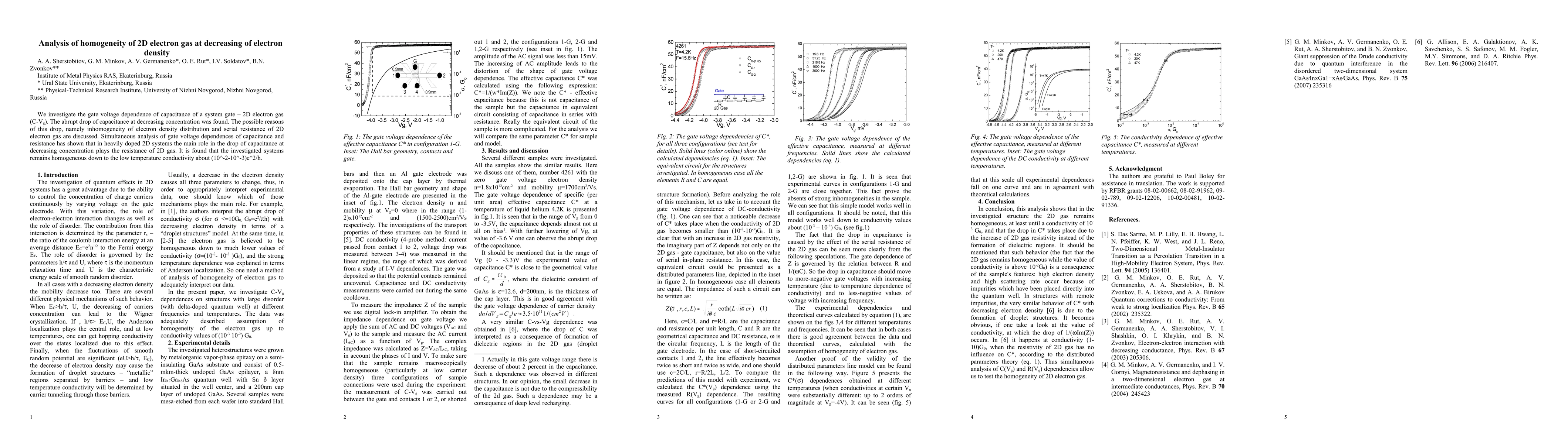 We investigate the gate voltage dependence of capacitance of a system gate - 2D electron gas (C-Vg). The abrupt drop of capacitance at decreasing concentration was found. The possible reasons of this drop, namely inhomogeneity of electron density distribution and serial resistance of 2D electron gas are discussed. Simultaneous analysis of gate voltage dependences of capacitance and resistance has shown that in heavily doped 2D systems the main role in the drop of capacitance at decreasing concentration plays the resistance of 2D gas. It is found that the investigated systems remains homogeneous down to the low temperature conductivity about (10^-2-10^-3)e^2/h.