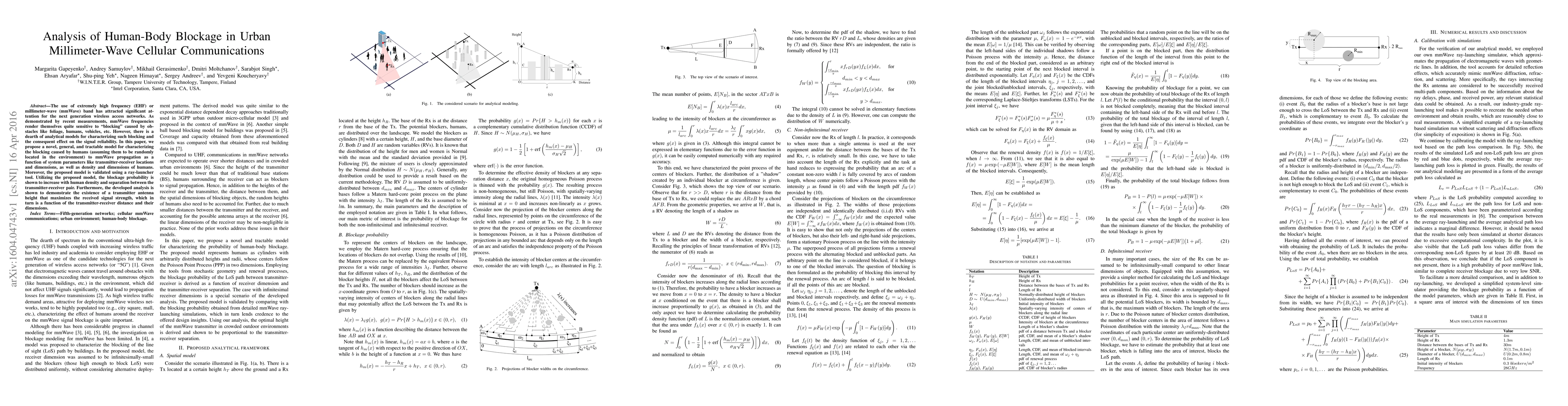 This paper proposes a novel analytical model to characterize human-body blockage in urban millimeter-wave cellular communications, validated by ray-launcher simulations. The study finds that blockage probability increases with human density and decreases with transmitter-receiver separation, and identifies an optimal antenna height for maximizing received signal strength.