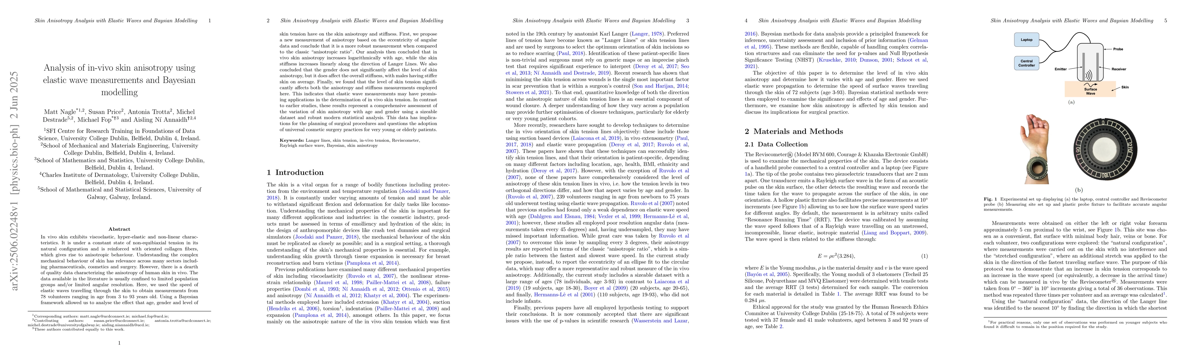 Elastic waves were used to measure skin properties from 78 volunteers across a wide age range (3-93 years). A Bayesian framework was employed to analyze the impact of age, gender, and skin tension on skin anisotropy and stiffness.