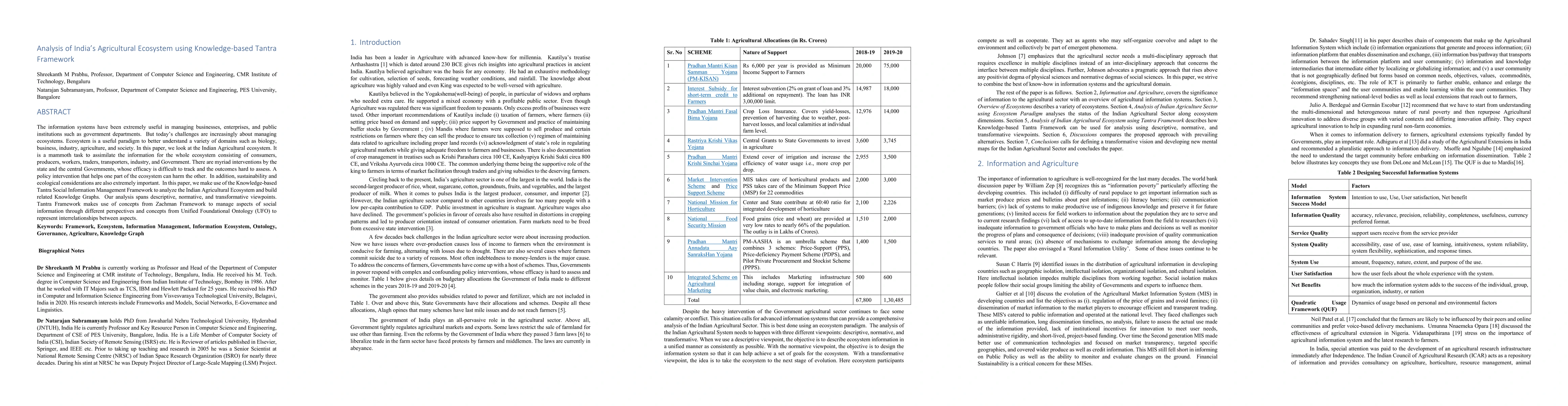 The information systems have been extremely useful in managing businesses, enterprises, and public institutions such as government departments. But current challenges are increasingly about managing ecosystems. Ecosystem is a useful paradigm to better understand a variety of domains such as biology, business, industry, agriculture, and society. In this paper, we look at the Indian Agricultural ecosystem. It is a mammoth task to assimilate the information for the whole ecosystem consisting of consumers, producers, workers, traders, transporters, industry, and Government. There are myriad interventions by the state and the central Governments, whose efficacy is difficult to track and the outcomes hard to assess. A policy intervention that helps one part of the ecosystem can harm the other. In addition, sustainability and ecological considerations are also extremely important. In this paper, we make use of the Knowledge-based Tantra Social Information Management Framework to analyze the Indian Agricultural Ecosystem and build related Knowledge Graphs. Our analysis spans descriptive, normative, and transformative viewpoints. Tantra Framework makes use of concepts from Zachman Framework to manage aspects of social information through different perspectives and concepts from Unified Foundational Ontology (UFO) to represent interrelationships between aspects.