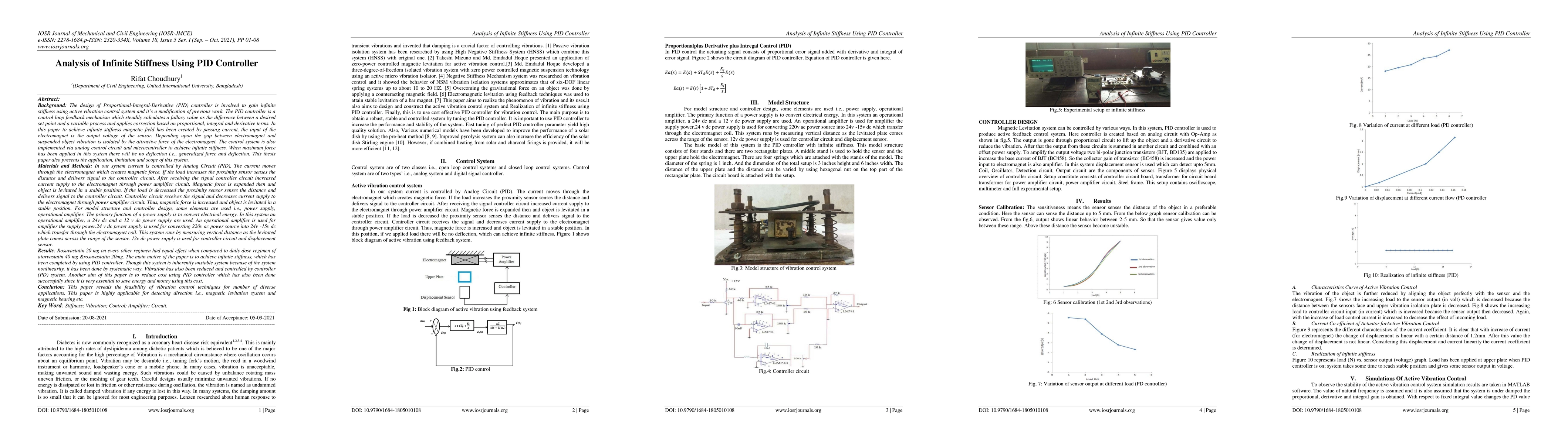 The design of Proportional Integral-Derivative (PID) controller is involved to gain infinite stiffness using active vibration control system and it is a modification of previous work. The PID controller is a control loop feedback mechanism which steadily calculates a fallacy value as the difference between a desired set point and a variable process and applies correction based on proportional, integral, and derivative terms. In this paper to achieve infinite stiffness magnetic field has been created by passing current, the input of the electromagnet is the output voltage of the sensor. Depending upon the gap between electromagnet and suspended object vibration is isolated by the attractive force of the electromagnet. This paper also presents the application, limitation, and scope of this system. In our system current is controlled by Analog Circuit (PID). The current moves through the electromagnet which creates magnetic force. If the load increases the proximity sensor senses the distance and delivers signal to the controller circuit. After receiving the signal controller circuit increased current supply to the electromagnet through power amplifier circuit. Magnetic force is expanded then, and object is levitated in a stable position. If the load is decreased the proximity sensor senses the distance and delivers signal to the controller circuit. Controller circuit receives the signal and decreases current supply to the electromagnet through power amplifier circuit. Thus, magnetic force is increased, and object is levitated in a stable position. This paper reveals the feasibility of vibration control techniques for number of diverse applications. This paper is highly applicable for detecting direction that is magnetic levitation system and magnetic bearing.