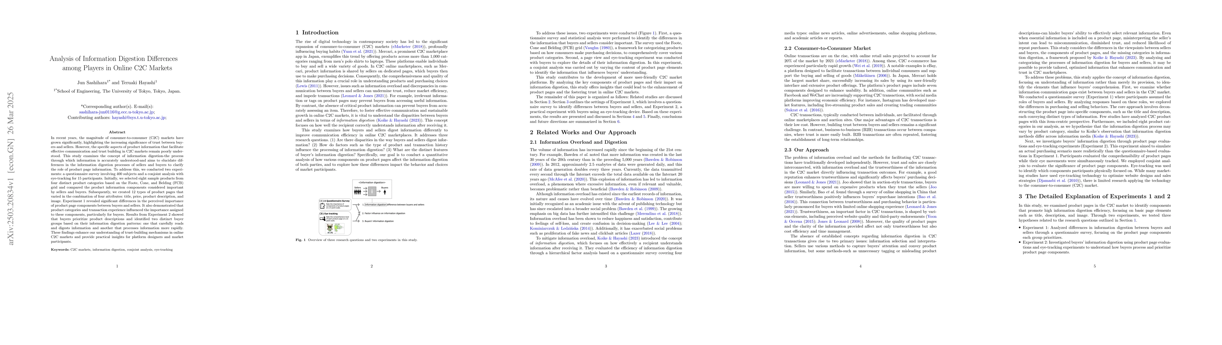 In recent years, the magnitude of consumer-to-consumer (C2C) markets have grown significantly, highlighting the increasing significance of trust between buyers and sellers. However, the specific aspects of product information that facilitate effective communication and trust building in C2C markets remain poorly understood. This study examines the concept of information digestion-the process through which information is accurately understood-and aims to elucidate differences in the information digestion processes of sellers and buyers to clarify the role of product page information. To address this, we conducted two experiments: a questionnaire survey involving 400 subjects and a conjoint analysis with eye-tracking for 15 participants. Initially, we selected eight sample products from four distinct product categories based on the Foote, Cone, and Belding (FCB) grid and compared the product information components considered important by sellers and buyers. Subsequently, we created 12 types of product pages that varied in the combination of four attributes: title, price, product description, and image. Experiment 1 revealed significant differences in the perceived importance of product page components between buyers and sellers. It also demonstrated that product categories and transaction experience influenced the importance assigned to these components, particularly for buyers. Results from Experiment 2 showed that buyers prioritize product descriptions and identified two distinct buyer groups based on their information digestion patterns: one that carefully reads and digests information and another that processes information more rapidly. These findings enhance our understanding of trust-building mechanisms in online C2C markets and provide practical insights for platform designers and market participants.