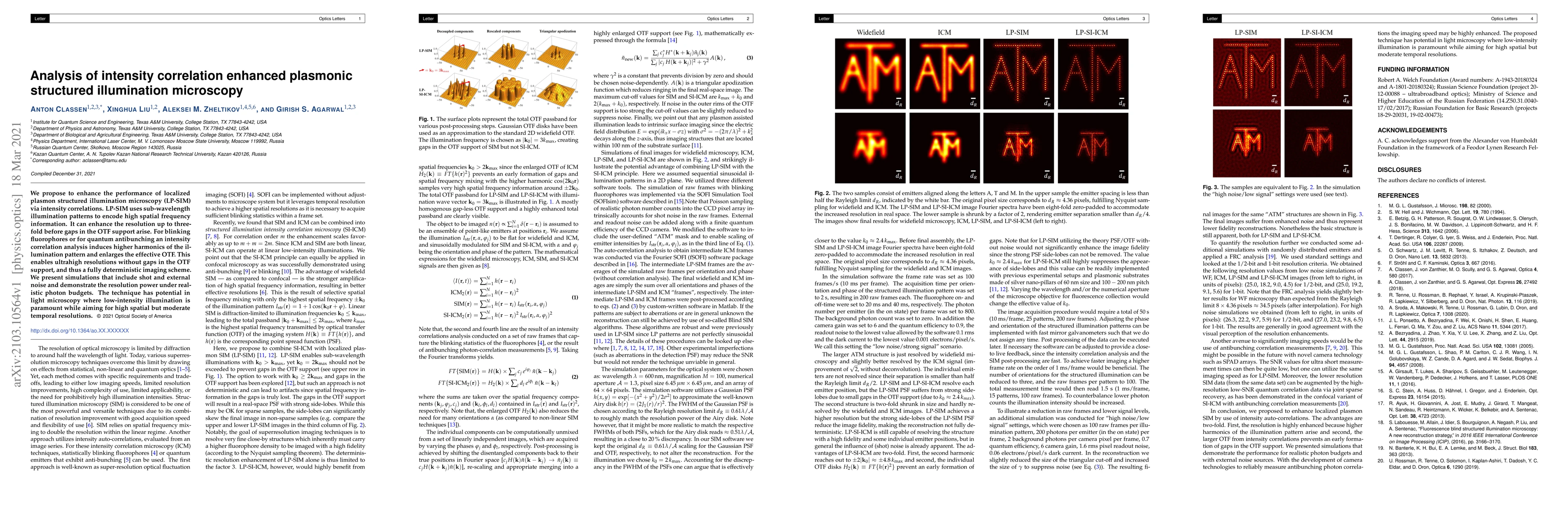 This paper proposes an enhancement of localized plasmon structured illumination microscopy (LP-SIM) using intensity correlations to improve resolution up to three-fold. The technique leverages higher harmonics from blinking fluorophores and quantum antibunching to achieve ultrahigh resolutions without gaps in the optical transfer function (OTF), enabling fully deterministic imaging.