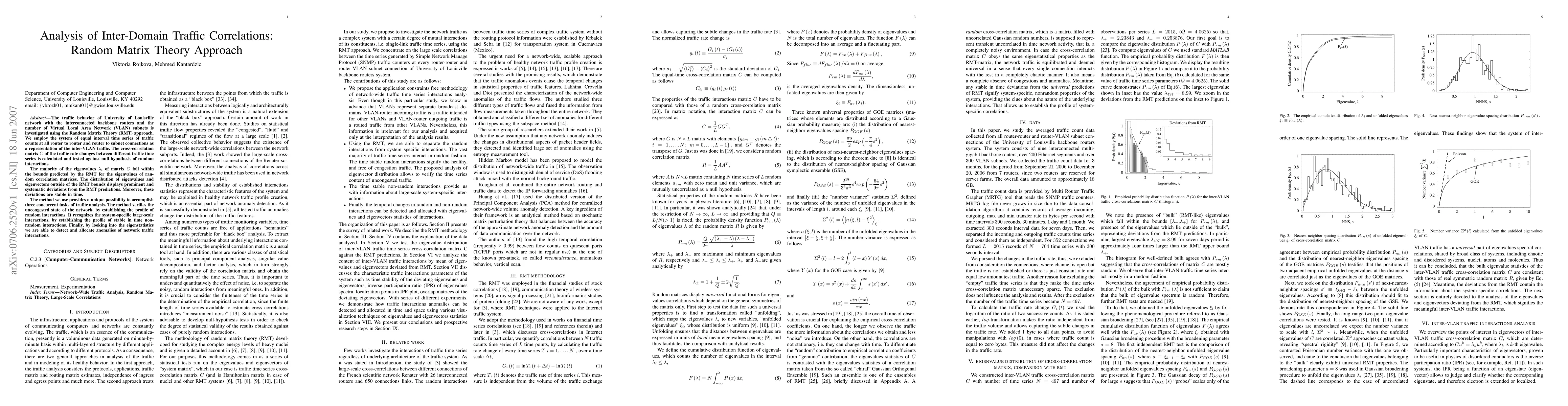 The traffic behavior of University of Louisville network with the interconnected backbone routers and the number of Virtual Local Area Network (VLAN) subnets is investigated using the Random Matrix Theory (RMT) approach. We employ the system of equal interval time series of traffic counts at all router to router and router to subnet connections as a representation of the inter-VLAN traffic. The cross-correlation matrix C of the traffic rate changes between different traffic time series is calculated and tested against null-hypothesis of random interactions. The majority of the eigenvalues \lambda_{i} of matrix C fall within the bounds predicted by the RMT for the eigenvalues of random correlation matrices. The distribution of eigenvalues and eigenvectors outside of the RMT bounds displays prominent and systematic deviations from the RMT predictions. Moreover, these deviations are stable in time. The method we use provides a unique possibility to accomplish three concurrent tasks of traffic analysis. The method verifies the uncongested state of the network, by establishing the profile of random interactions. It recognizes the system-specific large-scale interactions, by establishing the profile of stable in time non-random interactions. Finally, by looking into the eigenstatistics we are able to detect and allocate anomalies of network traffic interactions.
