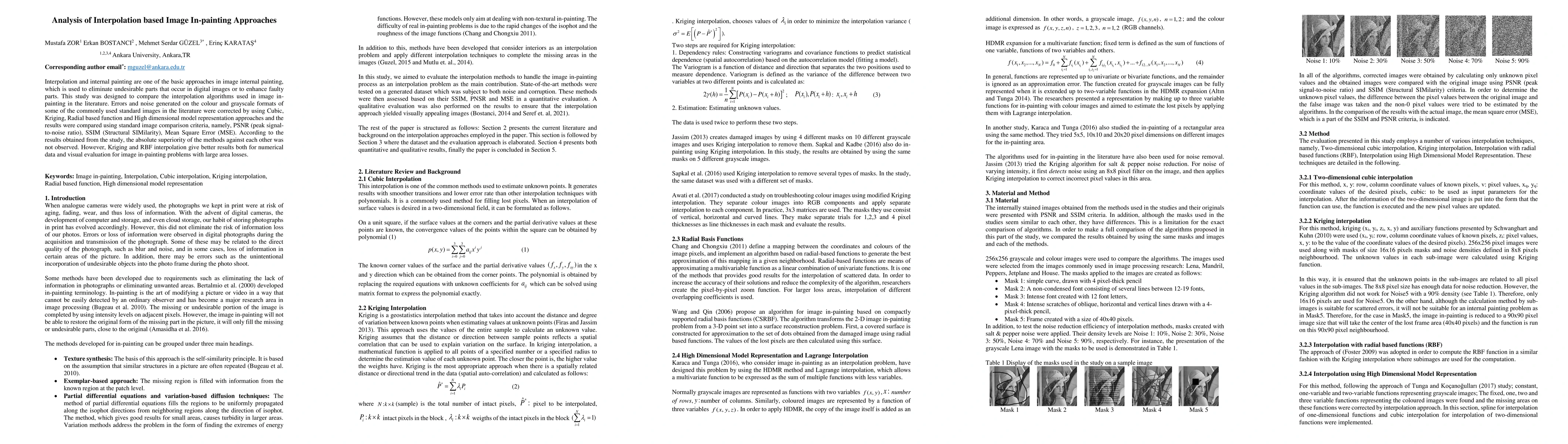 Interpolation and internal painting are one of the basic approaches in image internal painting, which is used to eliminate undesirable parts that occur in digital images or to enhance faulty parts. This study was designed to compare the interpolation algorithms used in image in-painting in the literature. Errors and noise generated on the colour and grayscale formats of some of the commonly used standard images in the literature were corrected by using Cubic, Kriging, Radial based function and High dimensional model representation approaches and the results were compared using standard image comparison criteria, namely, PSNR (peak signal-to-noise ratio), SSIM (Structural SIMilarity), Mean Square Error (MSE). According to the results obtained from the study, the absolute superiority of the methods against each other was not observed. However, Kriging and RBF interpolation give better results both for numerical data and visual evaluation for image in-painting problems with large area losses.