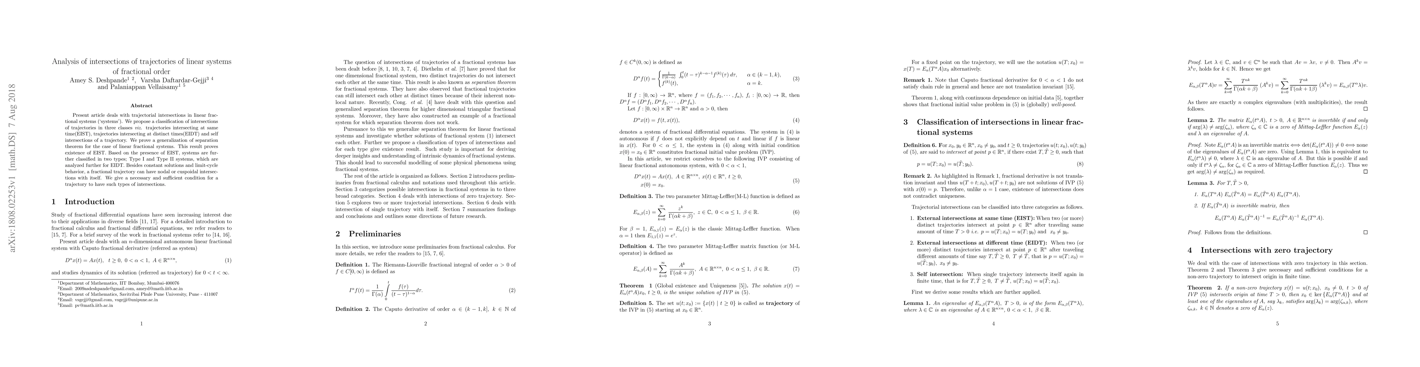 This paper classifies intersections of trajectories in linear fractional systems into three types: EIST, EIDT, and self-intersections. It proves the existence of EIST and further categorizes systems into Type I and Type II based on these intersections, analyzing their behavior and providing conditions for nodal or cuspoidal intersections.