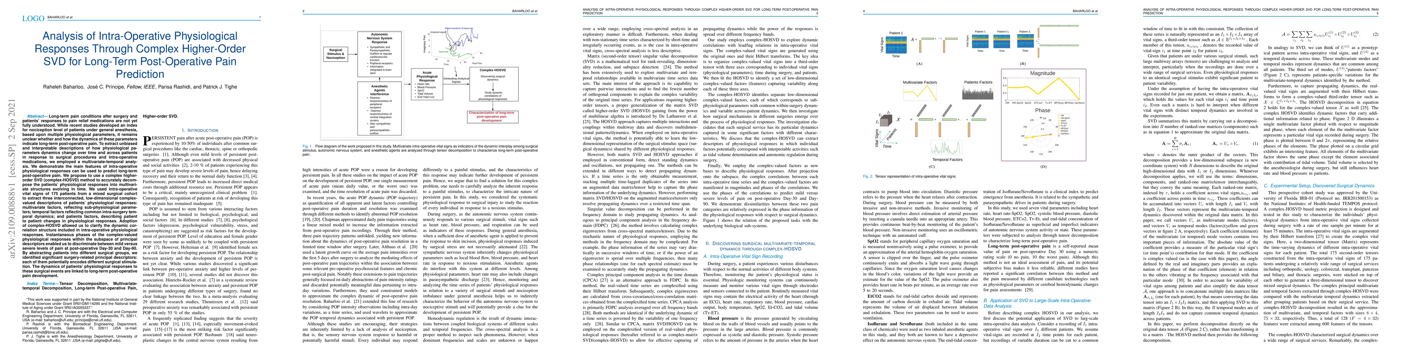 This study employs complex higher-order SVD to analyze intra-operative physiological responses, revealing that these dynamics can predict long-term post-operative pain. The method decomposes vital signs into factors reflecting sub-physiological parameters, temporal dynamics, and patient-specific variations, enabling discrimination between mild and severe pain levels.