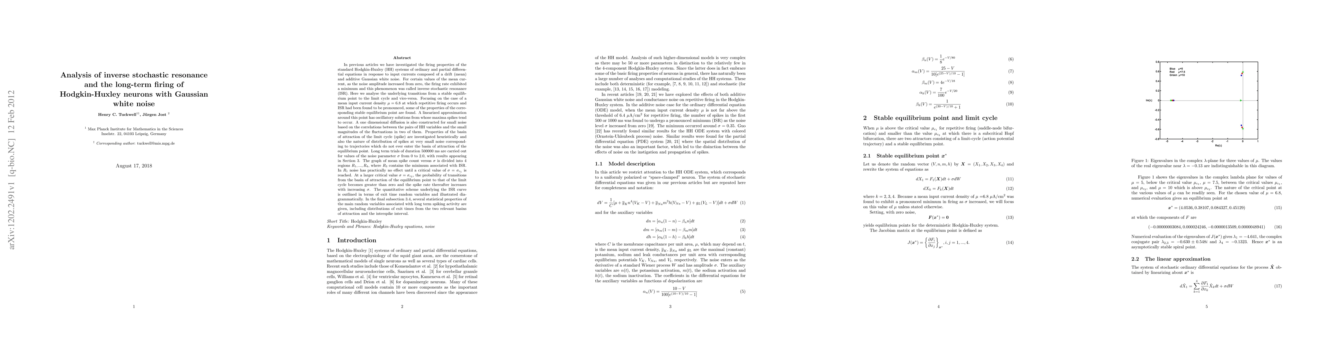 In previous articles we have investigated the firing properties of the standard Hodgkin-Huxley (HH) systems of ordinary and partial differential equations in response to input currents composed of a drift (mean) and additive Gaussian white noise. For certain values of the mean current, as the noise amplitude increased from zero, the firing rate exhibited a minimum and this phenomenon was called inverse stochastic resonance (ISR). Here we analyse the underlying transitions from a stable equilibrium point to the limit cycle and vice-versa. Focusing on the case of a mean input current density $\mu=6.8$ at which repetitive firing occurs and ISR had been found to be pronounced, some of the properties of the corresponding stable equilibrium point are found. A linearized approximation around this point has oscillatory solutions from whose maxima spikes tend to occur. A one dimensional diffusion is also constructed for small noise based on the correlations between the pairs of HH variables and the small magnitudes of the fluctuations in two of them. Properties of the basin of attraction of the limit cycle (spike) are investigated heuristically and also the nature of distribution of spikes at very small noise corresponding to trajectories which do not ever enter the basin of attraction of the equilibrium point. Long term trials of duration 500000 ms are carried out for values of the noise parameter $\sigma$ from 0 to 2.0, with results appearing in Section 3. The graph of mean spike count versus $\sigma$ is divided into 4 regions $R_1,...,R_4,$ where $R_3$ contains the minimum associated with ISR.