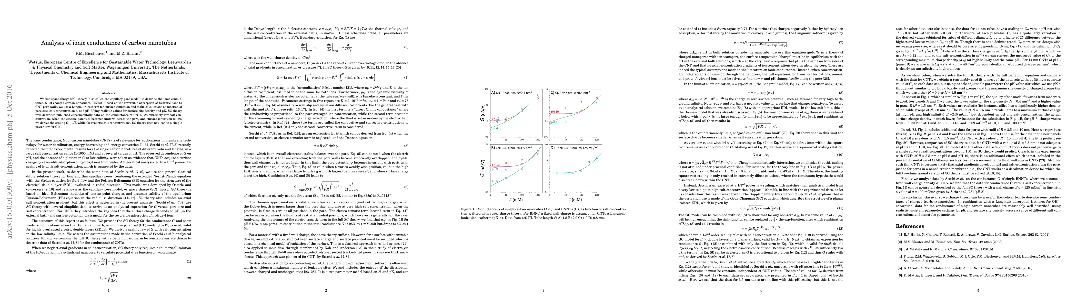 We use space-charge (SC) theory (also called the capillary pore model) to describe the ionic conductance, $G$, of charged carbon nanotubes (CNTs). Based on the reversible adsorption of hydroxyl ions to CNT pore walls, we use a Langmuir isotherm for surface ionization and make calculations as function of pore size, salt concentration $c$, and pH. Using realistic values for surface site density and pK, SC theory well describes published experimentally data on the conductance of CNTs. At extremely low salt concentration, when the electric potential becomes uniform across the pore, and surface ionization is low, we derive the scaling $G\sim \sqrt{c}$, while for realistic salt concentrations, SC theory does not lead to a simple power law for $G(c)$.