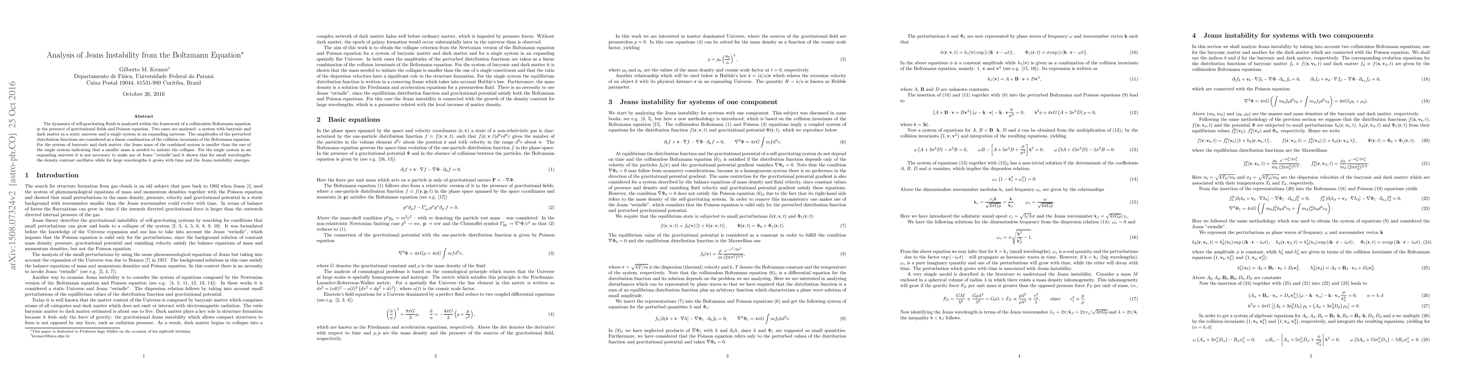 The dynamics of self-gravitating fluids is analyzed within the framework of a collisionless Boltzmann equation in the presence of gravitational fields and Poisson equation. Two cases are analyzed: a system with baryonic and dark matter in a static universe and a single system in an expanding universe. The amplitudes of the perturbed distribution functions are considered as a linear combination of the collision invariants of the Boltzmann equation. For the system of baryonic and dark matter, the Jeans mass of the combined system is smaller than the one of the single system indicating that a smaller mass is needed to initiate the collapse. For the single system in an expanding universe it is not necessary to make use of Jeans "swindle"and it shown that for small wavelengths the density contrast oscillates while for large wavelengths it grows with time and the Jeans instability emerges.