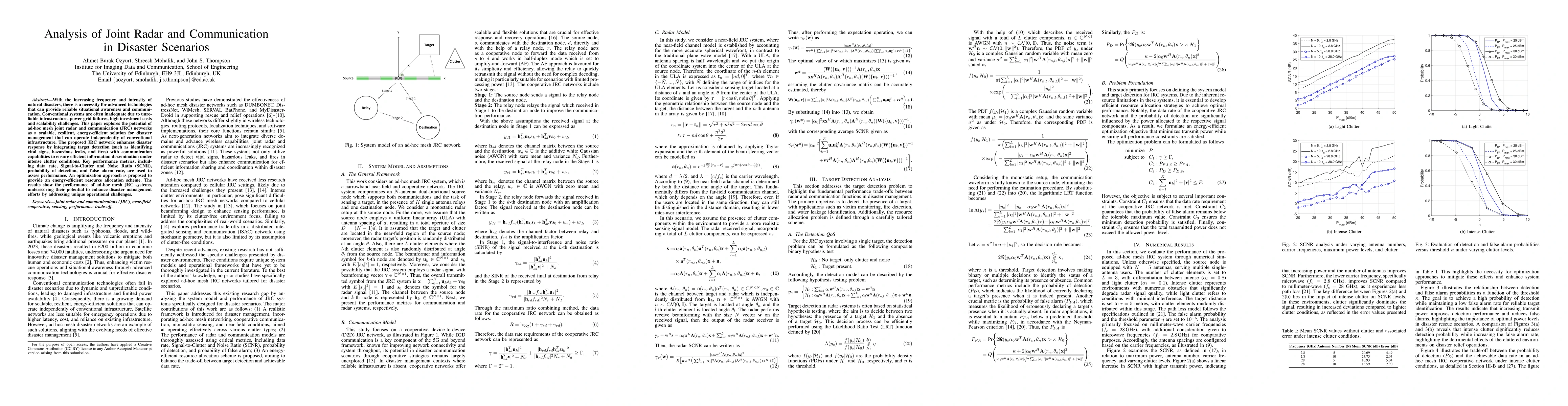 The paper explores the potential of ad-hoc mesh joint radar and communication (JRC) networks for disaster management, integrating target detection with communication capabilities to ensure efficient information dissemination under intense clutter conditions.