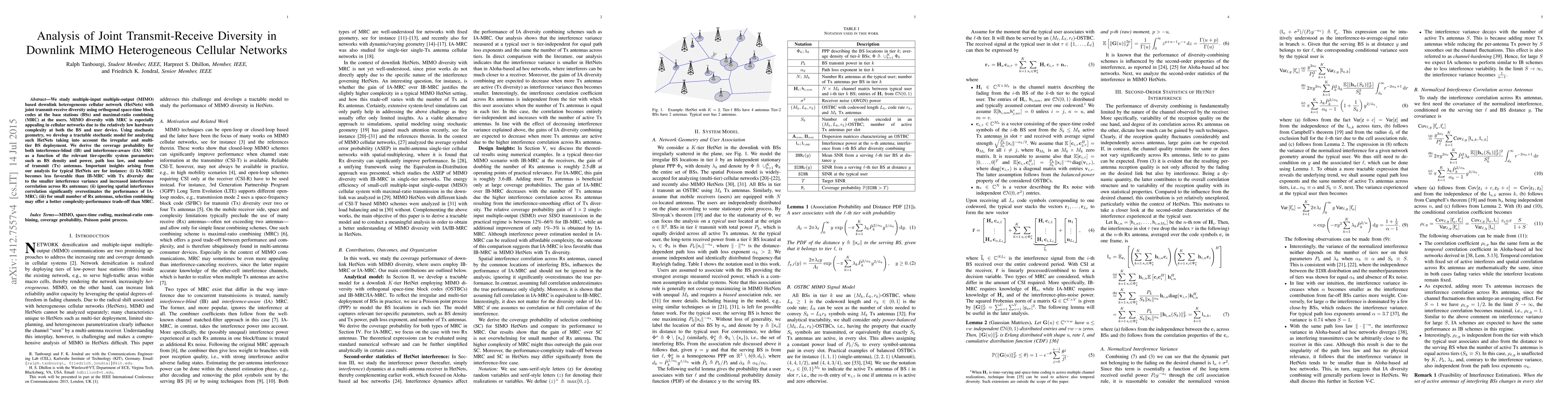 This paper analyzes MIMO-based downlink heterogeneous cellular networks using joint transmit-receive diversity and stochastic geometry to model irregular multi-tier base station deployments. It finds that interference-aware maximal-ratio combining is less favorable than interference-blind combining due to reduced interference variance and increased correlation, and that selection combining may outperform MRC for small receiver antenna counts.