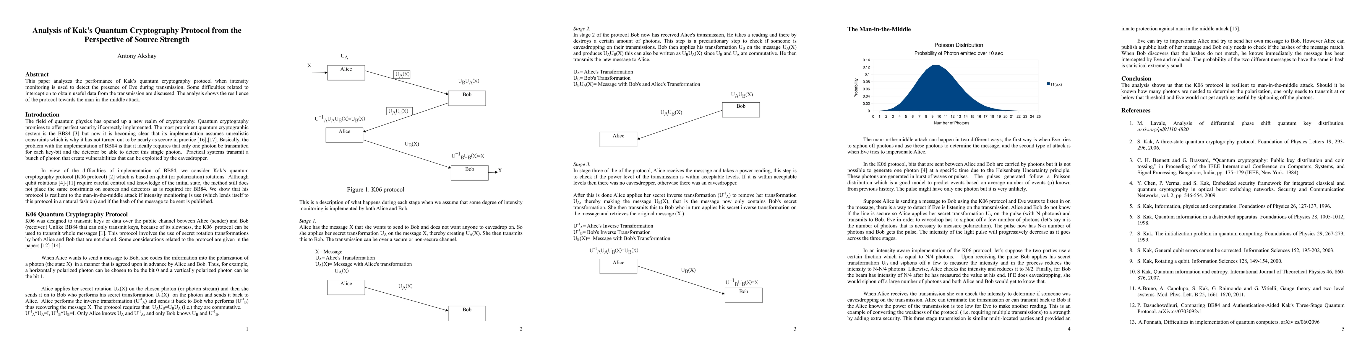 This paper analyzes the performance of Kak's quantum cryptography protocol when intensity monitoring is used to detect the presence of Eve during transmission. Some difficulties related to interception to obtain useful data from the transmission are discussed. The analysis shows the resilience of the protocol towards the man-in-the-middle attack.