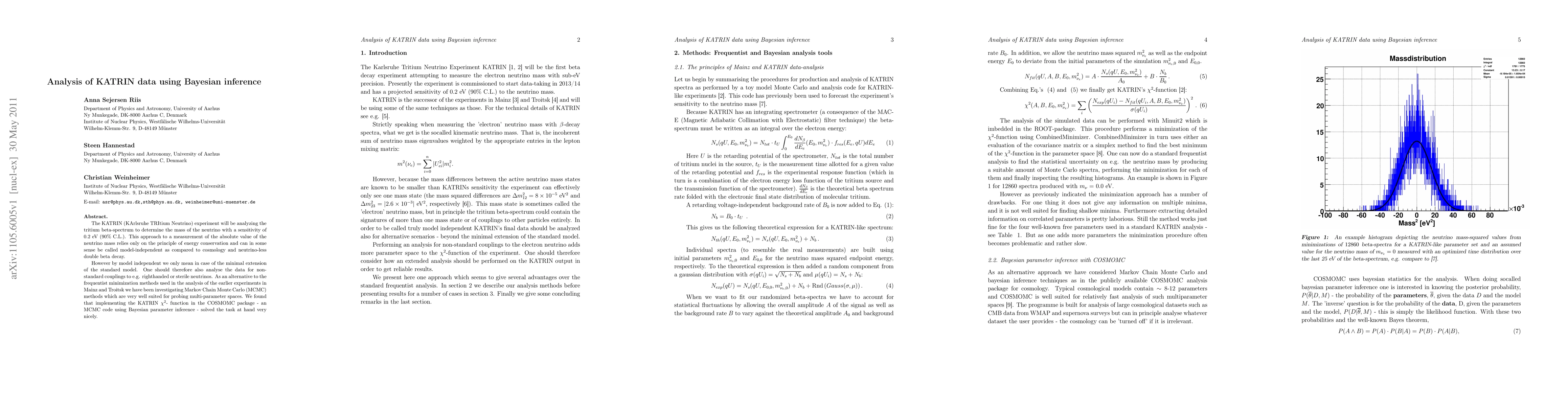 The KATRIN (KArlsruhe TRItium Neutrino) experiment will be analyzing the tritium beta-spectrum to determine the mass of the neutrino with a sensitivity of 0.2 eV (90% C.L.). This approach to a measurement of the absolute value of the neutrino mass relies only on the principle of energy conservation and can in some sense be called model-independent as compared to cosmology and neutrino-less double beta decay. However by model independent we only mean in case of the minimal extension of the standard model. One should therefore also analyse the data for non-standard couplings to e.g. righthanded or sterile neutrinos. As an alternative to the frequentist minimization methods used in the analysis of the earlier experiments in Mainz and Troitsk we have been investigating Markov Chain Monte Carlo (MCMC) methods which are very well suited for probing multi-parameter spaces. We found that implementing the KATRIN chi squared function in the COSMOMC package - an MCMC code using Bayesian parameter inference - solved the task at hand very nicely.