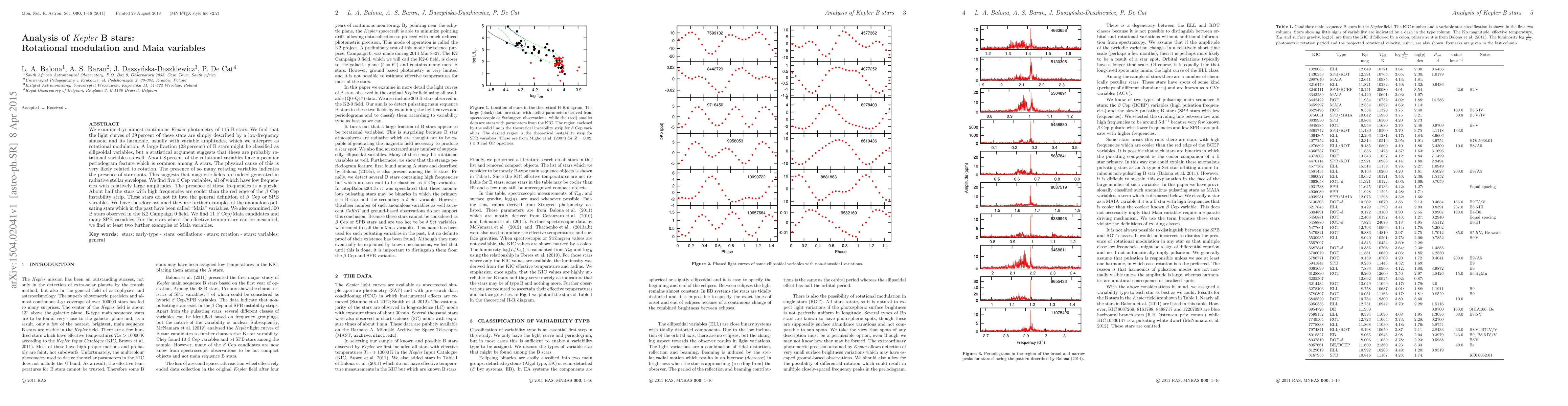 This study analyzes 4-year Kepler photometry of 115 B stars, revealing that 39% exhibit rotational modulation, while 28% may be ellipsoidal variables likely due to rotation. About 8% show peculiar periodograms similar to A stars, suggesting magnetic field generation in radiative envelopes. Five beta Cep variables and several "Maia" candidates were identified, expanding the classification of anomalous pulsating stars.