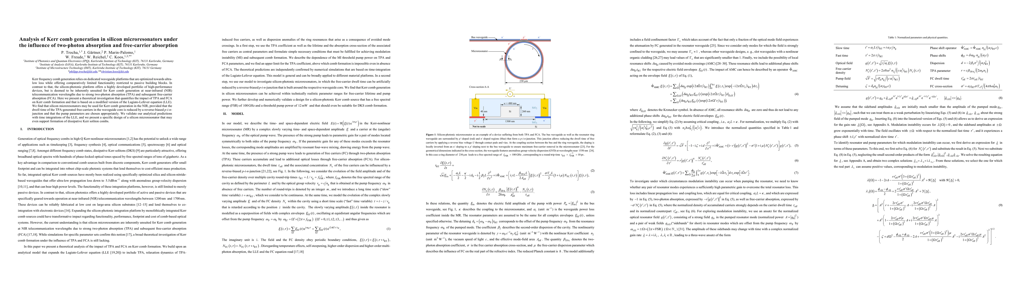 Kerr frequency comb generation relies on dedicated waveguide platforms that are optimized towards ultralow loss while offering comparatively limited functionality restricted to passive building blocks. In contrast to that, the silicon-photonic platform offers a highly developed portfolio of high-performance devices, but is deemed to be inherently unsuited for Kerr comb generation at near-infrared (NIR) telecommunication wavelengths due to strong two-photon absorption (TPA) and subsequent free-carrier absorption (FCA). Here we present a theoretical investigation that quantifies the impact of TPA and FCA on Kerr comb formation and that is based on a modified version of the Lugiato-Lefever equation (LLE). We find that silicon microresonators may be used for Kerr comb generation in the NIR, provided that the dwell time of the TPA-generated free-carriers in the waveguide core is reduced by a reverse-biased p-i-njunction and that the pump parameters are chosen appropriately. We validate our analytical predictions with time integrations of the LLE, and we present a specific design of a silicon microresonator that may even support formation of dissipative Kerr soliton combs.