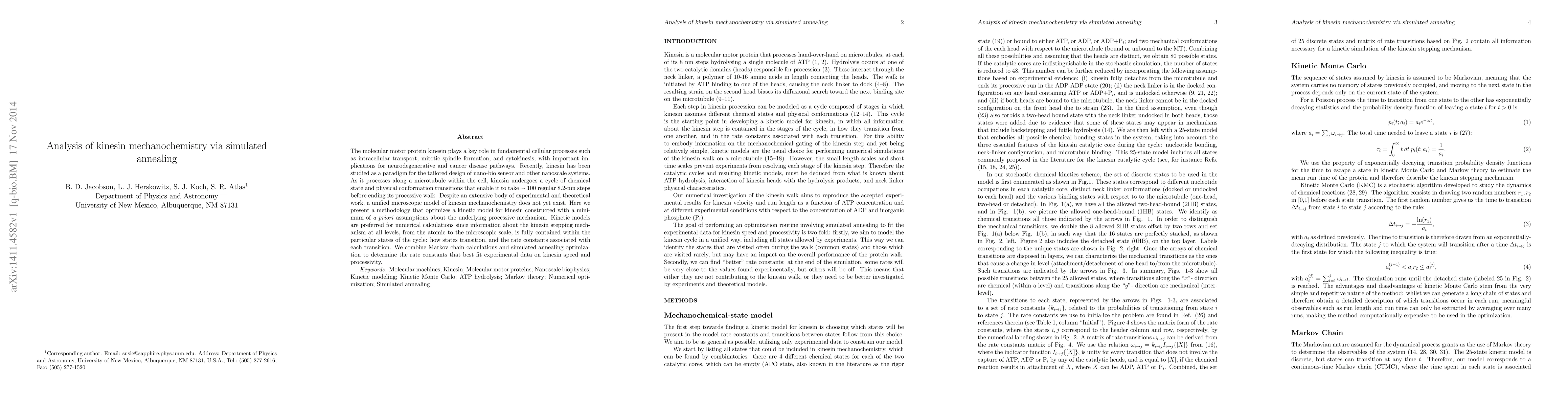 This paper develops a kinetic model for kinesin mechanochemistry using simulated annealing optimization, aiming to fit experimental data on kinesin speed and processivity without relying on extensive a priori assumptions. The study combines Markov chain calculations and simulated annealing to determine rate constants, contributing to a better understanding of kinesin's molecular motor function.