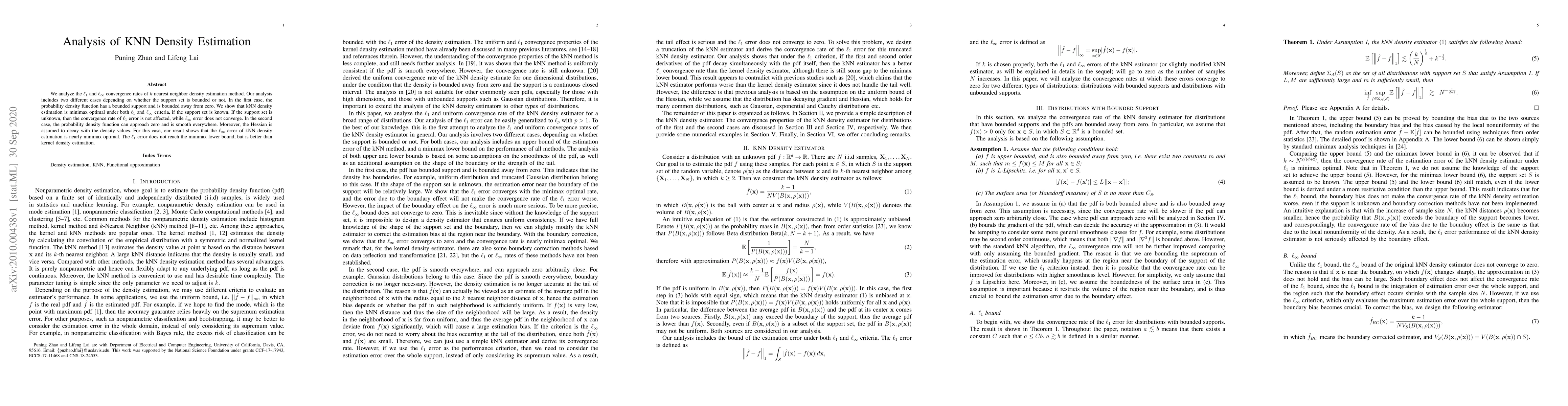 This paper analyzes the convergence rates of k nearest neighbor (kNN) density estimation under $\ell_1$ and $\ell_\infty$ criteria, showing that kNN is minimax optimal when the support set is bounded and known. When the support set is unknown, $\ell_1$ error remains optimal, but $\ell_\infty$ error does not converge. For smooth densities where the Hessian decays, kNN is nearly minimax optimal for $\ell_\infty$ error, though $\ell_1$ error is better than kernel density estimation but not optimal.