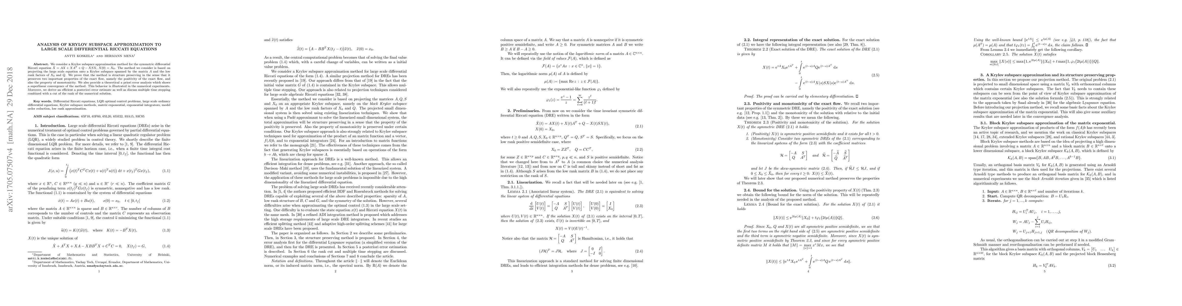 A new method for solving large-scale differential Riccati equations using Krylov subspace approximation is presented, showing superlinear convergence and preserving key properties of the exact flow.