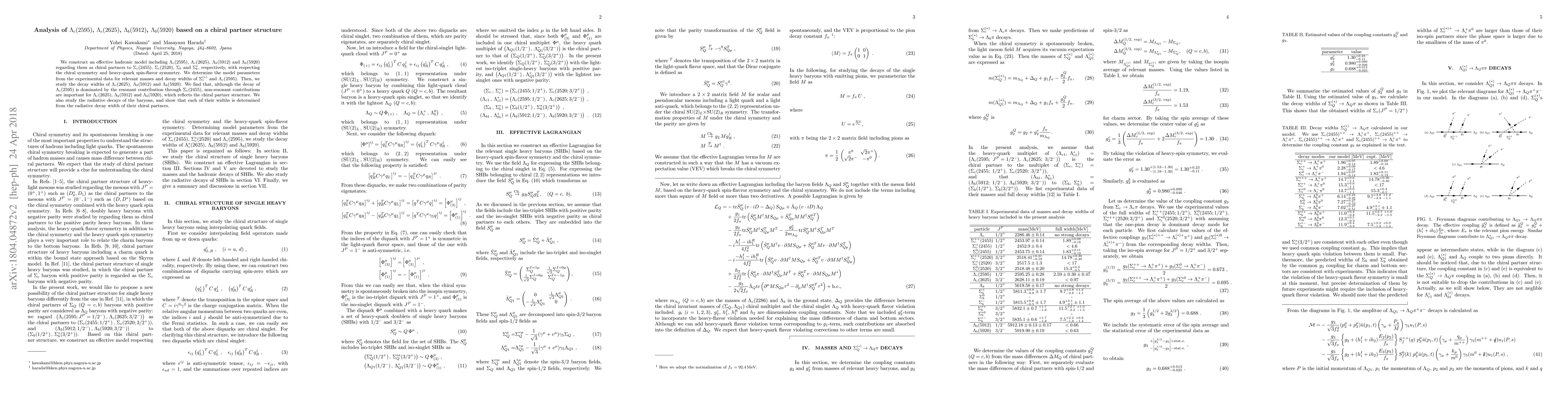 We construct an effective hadronic model including $\Lambda_c(2595)$, $\Lambda_c(2625)$, $\Lambda_b(5912)$ and $\Lambda_b(5920)$ regarding them as chiral partners to $\Sigma_c(2455)$, $\Sigma_c(2520)$, $\Sigma_b$ and $\Sigma_b^\ast$, respectively, with respecting the chiral symmetry and heavy-quark spin-flavor symmetry. We determine the model parameters from the experimental data for relevant masses and decay widths of $\Sigma_c^{(\ast)}$ and $\Lambda_c(2595)$. Then, we study the decay widths of $\Lambda_c(2625)$, $\Lambda_b(5912)$ and $\Lambda_b(5920)$. We find that, although the decay of $\Lambda_c(2595)$ is dominated by the resonant contribution through $\Sigma_c(2455)$, non-resonant contributions are important for $\Lambda_c(2625)$, $\Lambda_b(5912)$ and $\Lambda_b(5920)$, which reflects the chiral partner structure. We also study the radiative decays of the baryons, and show that each of their widths is determined from the radiative decay width of their chiral partners.
