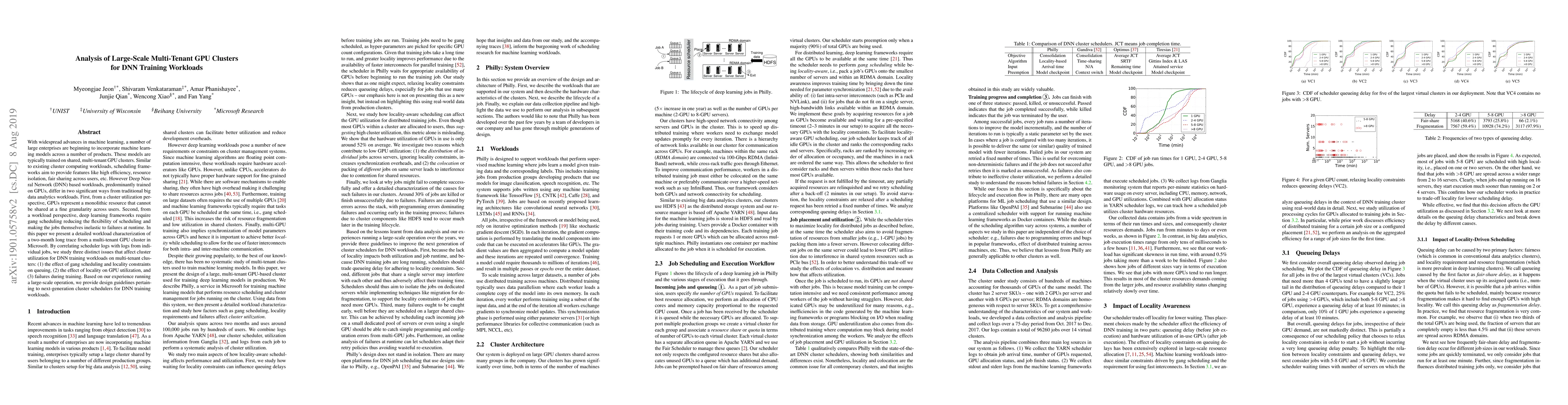 This paper analyzes a two-month trace from a multi-tenant GPU cluster used for training Deep Neural Networks (DNNs), identifying three key issues: gang scheduling impacts on queuing, locality effects on GPU utilization, and runtime failures. It provides design guidelines for next-generation cluster schedulers tailored to DNN training workloads.