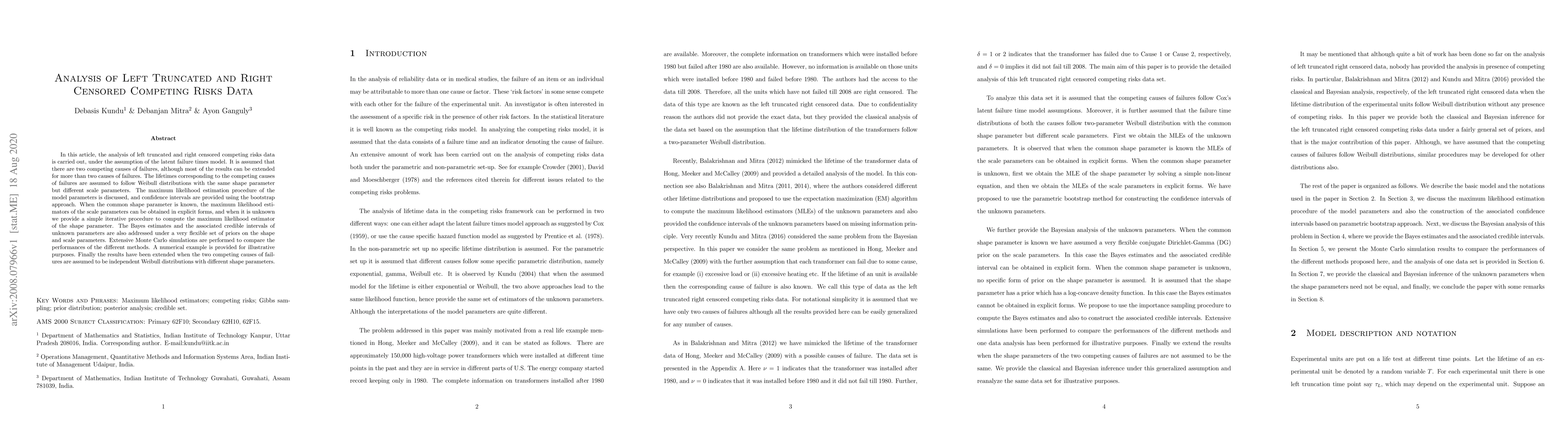 This paper analyzes left truncated and right censored competing risks data using a latent failure times model, focusing on two competing failure causes following Weibull distributions. It discusses maximum likelihood estimation, bootstrap confidence intervals, and Bayes estimates, with extensive Monte Carlo simulations comparing different methods.