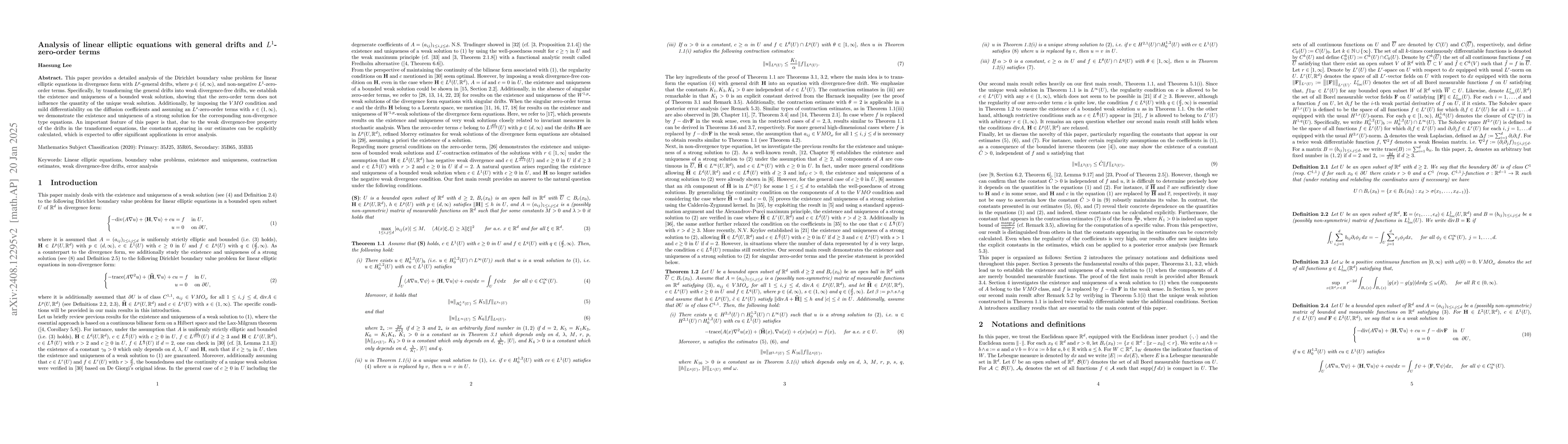 This paper provides a detailed analysis of the Dirichlet boundary value problem for linear elliptic equations in divergence form with $L^p$-general drifts, where $p \in (d, \infty)$, and non-negative $L^1$-zero-order terms. Specifically, by transforming the general drifts into weak divergence-free drifts, we establish the existence and uniqueness of a bounded weak solution, showing that the zero-order term does not influence the quantity of the unique weak solution. Additionally, by imposing the $ VMO$ condition and mild differentiability on the diffusion coefficients and assuming an $L^s$-zero-order terms with $s \in (1, \infty)$, we demonstrate the existence and uniqueness of a strong solution for the corresponding non-divergence type equations. An important feature of this paper is that, due to the weak divergence-free property of the drifts in the transformed equations, the constants appearing in our estimates can be explicitly calculated, which is expected to offer significant applications in error analysis.