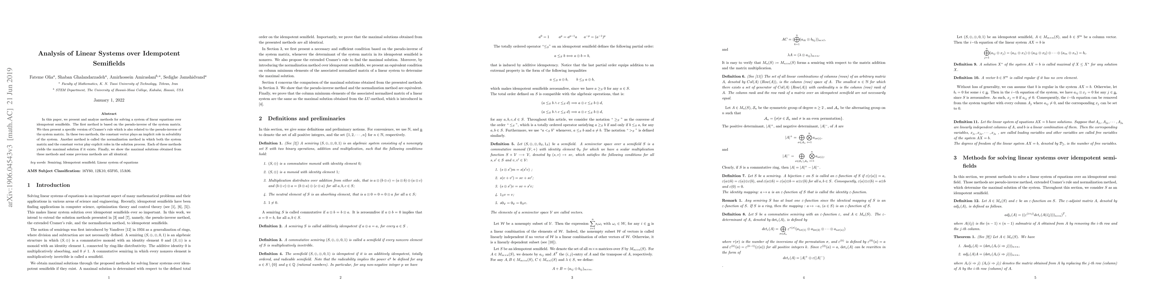 This paper analyzes methods for solving linear systems over idempotent semifields, including a pseudo-inverse approach, a modified Cramer's rule, and a normalization method, all yielding maximal solutions when they exist. The results show that all maximal solutions obtained from these methods are identical.