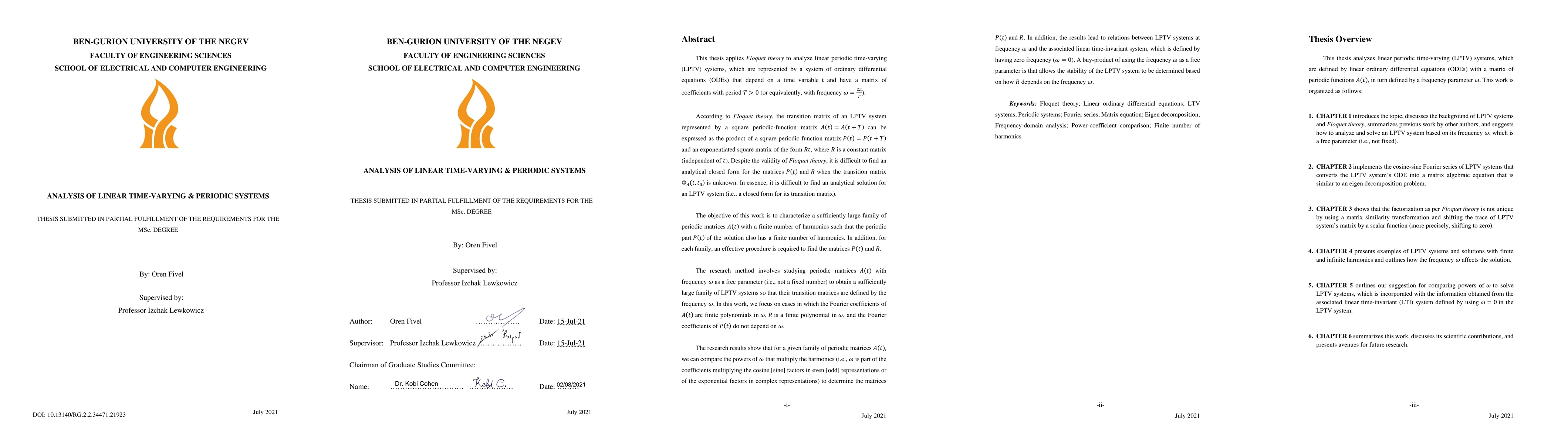 This thesis uses Floquet theory to analyze linear periodic time-varying systems, finding that powers of a frequency can determine the transition matrix, leading to new relations between LPTV systems and their associated linear time-invariant counterparts.
