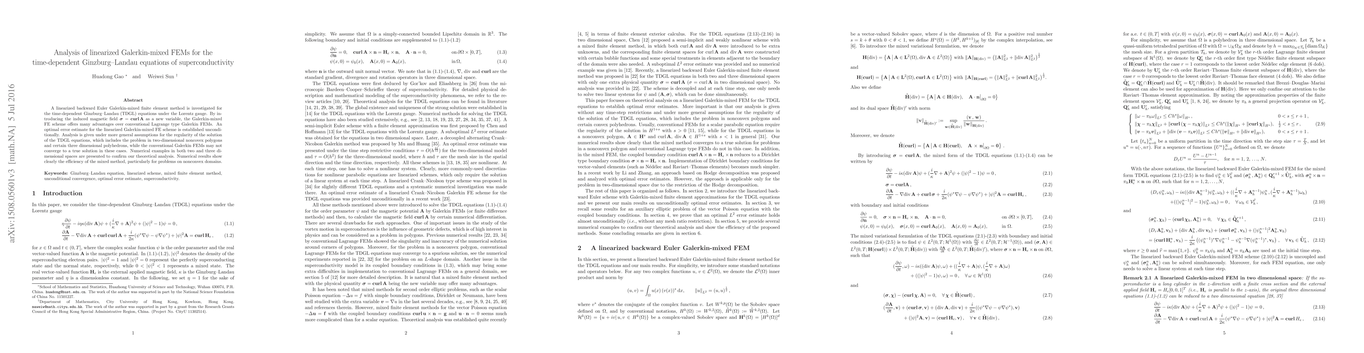 This paper investigates a linearized backward Euler Galerkin-mixed finite element method for solving the time-dependent Ginzburg-Landau equations, demonstrating optimal error estimates and efficiency, especially for nonconvex domains. Numerical examples confirm the theoretical analysis and highlight the mixed method's advantages over conventional methods.