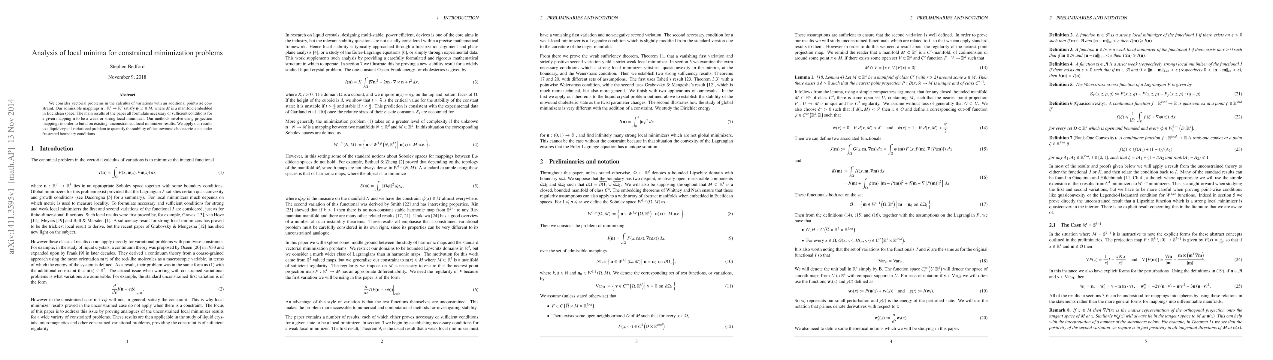 We consider vectorial problems in the calculus of variations with an additional pointwise constraint. Our admissible mappings ${\bf n}:\mathbb{R}^k\rightarrow \mathbb{R}^d$ satisfy ${\bf n}(x)\in M$, where $M$ is a manifold embedded in Euclidean space. The main results of the paper all formulate necessary or sufficient conditions for a given mapping ${\bf n}$ to be a weak or strong local minimizer. Our methods involve using projection mappings in order to build on existing, unconstrained, local minimizer results. We apply our results to a liquid crystal variational problem to quantify the stability of the unwound cholesteric state under frustrated boundary conditions.