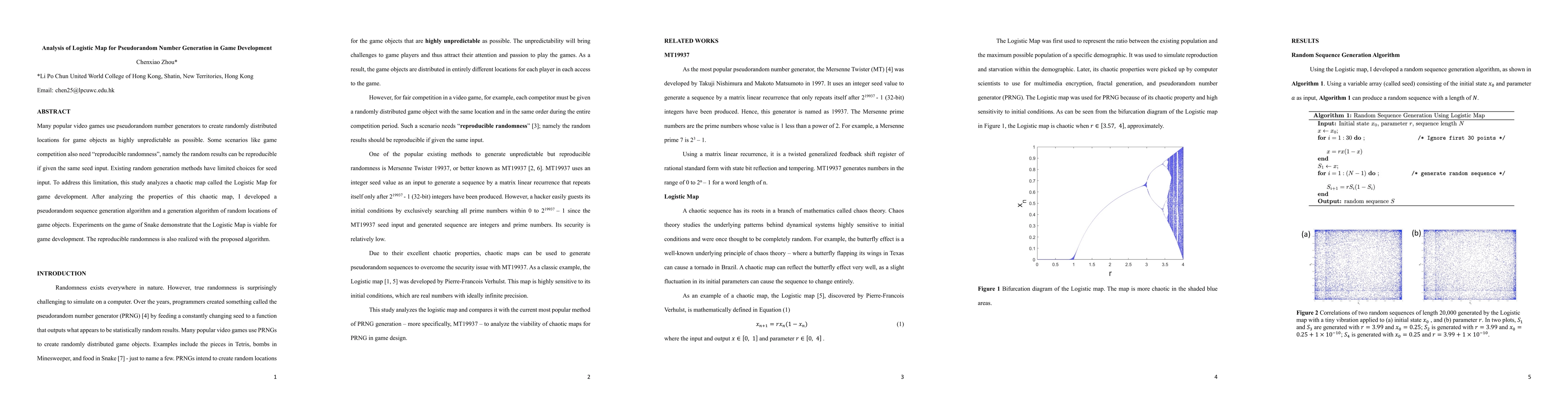 This study analyzes the Logistic Map, a chaotic map, to enhance pseudorandom number generation in game development, addressing limited seed input choices. The developed algorithm successfully generates reproducible random locations for game objects, as demonstrated in the Snake game.