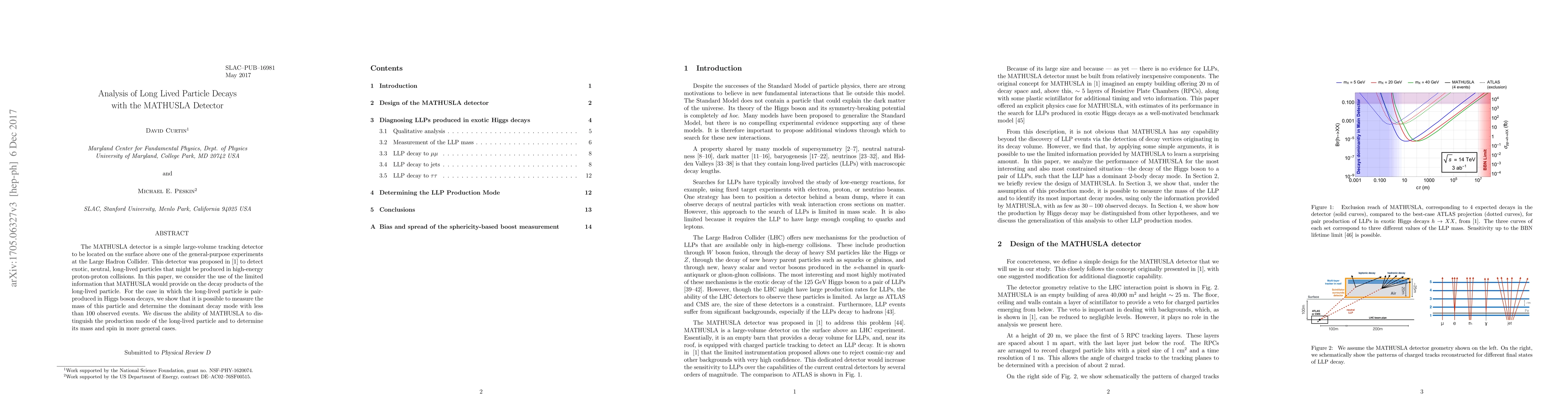 The paper presents a detailed analysis of using the MATHUSLA detector to measure the mass and determine the dominant decay mode of long-lived particles, including methods for distinguishing production modes and utilizing sphericity-based boost reconstruction for jet decays.