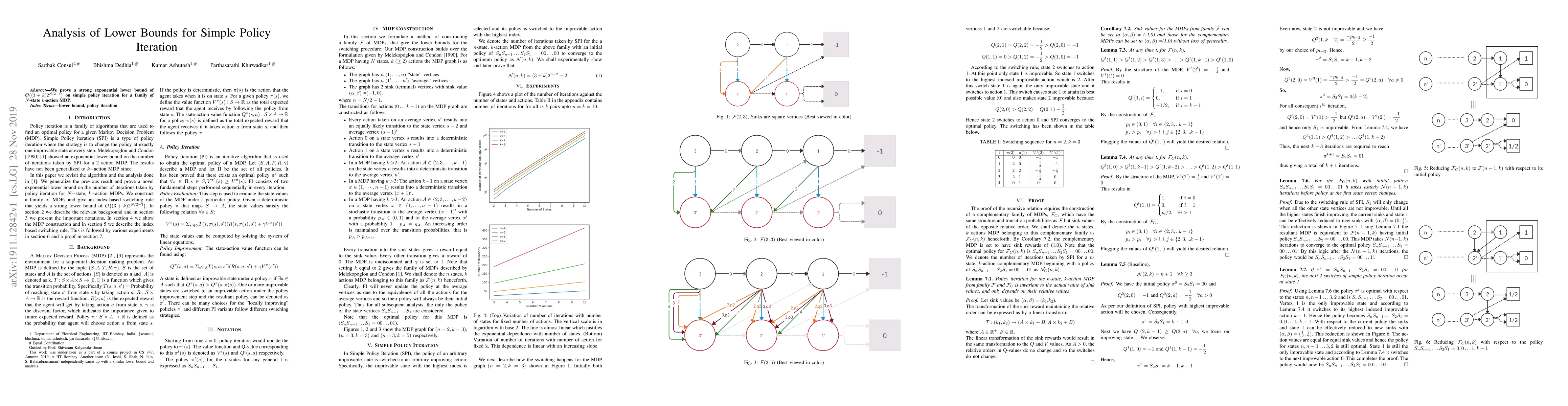 Policy iteration is a family of algorithms that are used to find an optimal policy for a given Markov Decision Problem (MDP). Simple Policy iteration (SPI) is a type of policy iteration where the strategy is to change the policy at exactly one improvable state at every step. Melekopoglou and Condon [1990] showed an exponential lower bound on the number of iterations taken by SPI for a 2 action MDP. The results have not been generalized to $k-$action MDP since. In this paper, we revisit the algorithm and the analysis done by Melekopoglou and Condon. We generalize the previous result and prove a novel exponential lower bound on the number of iterations taken by policy iteration for $N-$state, $k-$action MDPs. We construct a family of MDPs and give an index-based switching rule that yields a strong lower bound of $\mathcal{O}\big((3+k)2^{N/2-3}\big)$.