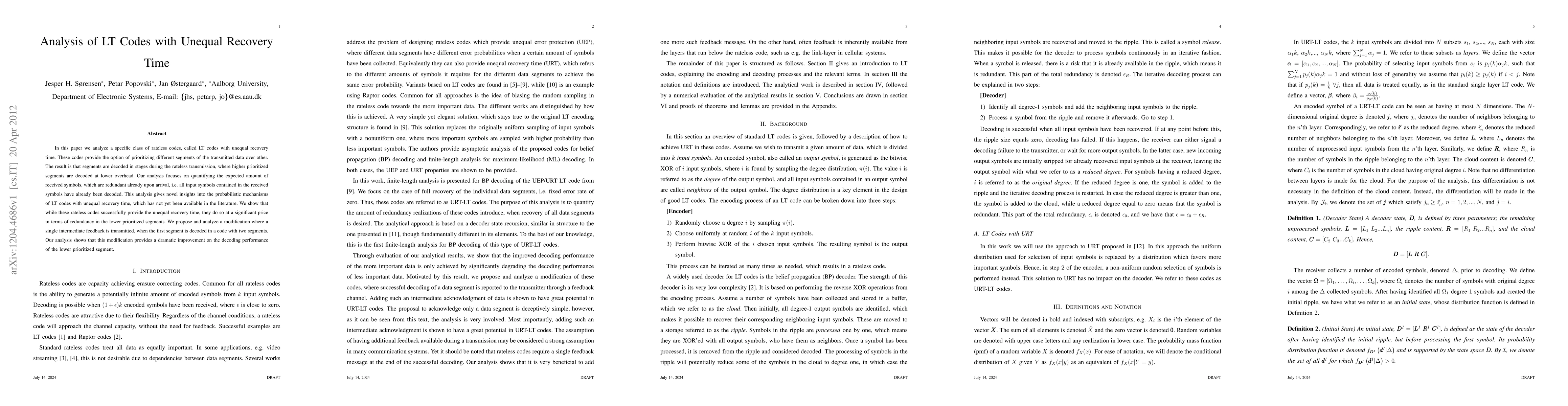 This paper analyzes LT codes with unequal recovery time, focusing on prioritizing different data segments. It reveals significant redundancy in lower-priority segments and proposes a modification with intermediate feedback to improve decoding performance for these segments.