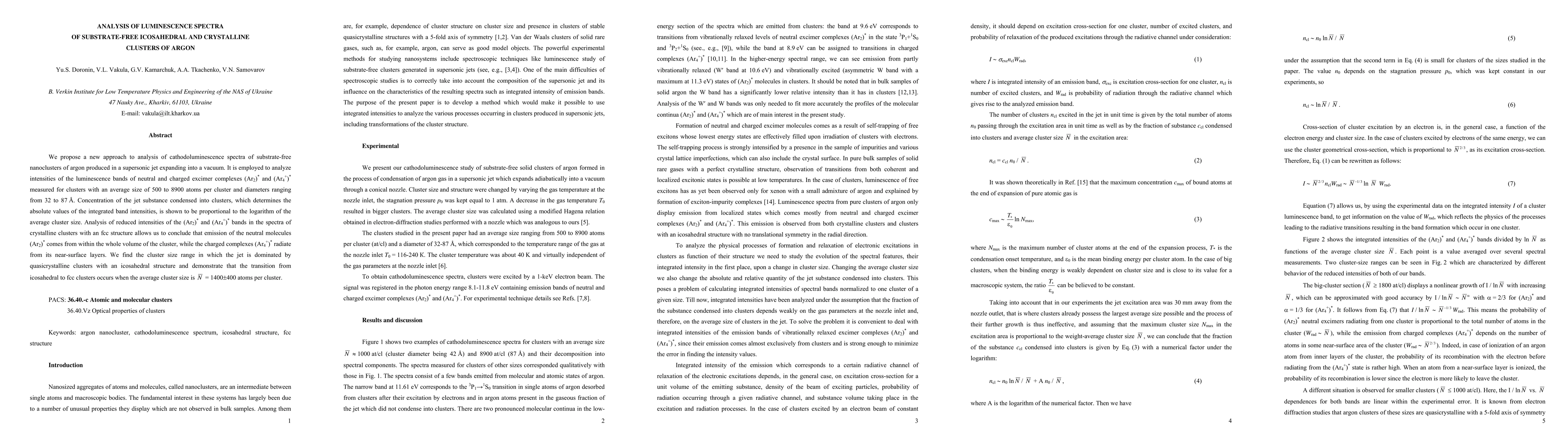 Researchers analyzed luminescence spectra of argon nanoclusters to understand their structure and emission behavior, finding that neutral molecules radiate from within clusters while charged complexes emit from near-surface layers.