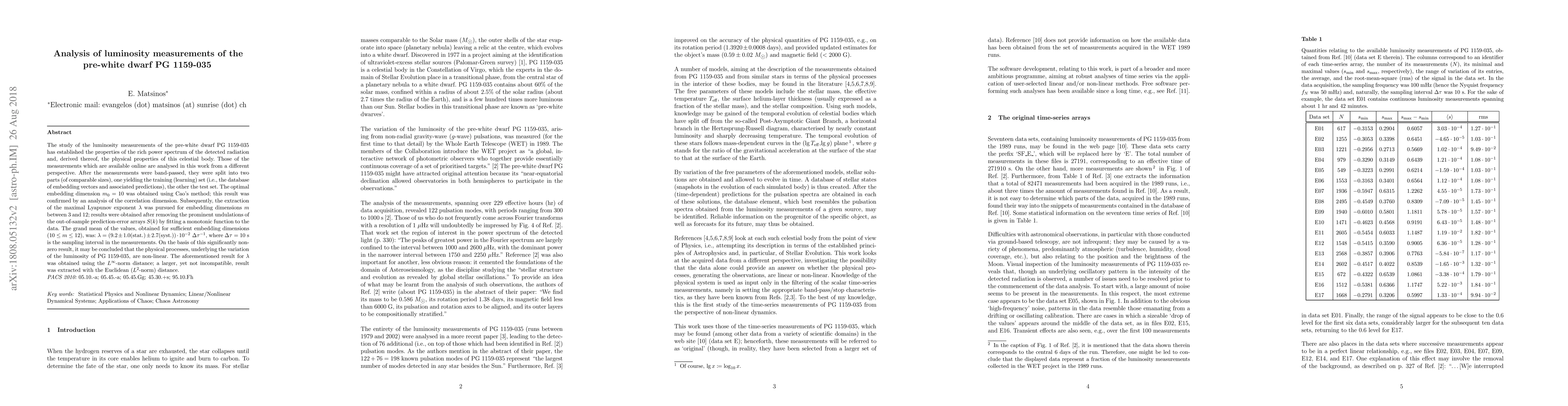 This paper analyzes luminosity measurements of the pre-white dwarf PG 1159-035, revealing a rich power spectrum and deriving physical properties from the data. The study finds a maximal Lyapunov exponent $\lambda = (9.2 \pm 1.0 ({\rm stat.}) \pm 2.7 ({\rm syst.})) \cdot 10^{-2}~\Delta \tau^{-1}$, indicating non-linear physical processes underlying the luminosity variations.