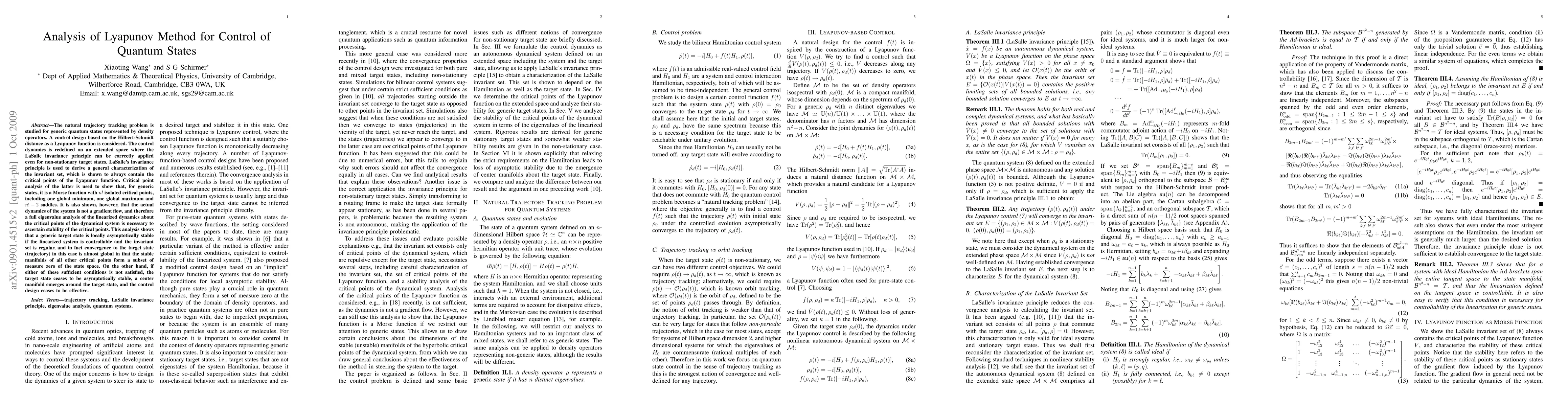 The natural trajectory tracking problem is studied for generic quantum states represented by density operators. A control design based on the Hilbert-Schmidt distance as a Lyapunov function is considered. The control dynamics is redefined on an extended space where the LaSalle invariance principle can be correctly applied even for non-stationary target states. LaSalle's invariance principle is used to derive a general characterization of the invariant set, which is shown to always contain the critical points of the Lyapunov function. Critical point analysis of the latter is used to show that, for generic states, it is a Morse function with $n!$ isolated critical points, including one global minimum, one global maximum and $n!-2$ saddles. It is also shown, however, that the actual dynamics of the system is not a gradient flow, and therefore a full eigenvalue analysis of the linearized dynamics about the critical points of the dynamical system is necessary to ascertain stability of the critical points. This analysis shows that a generic target state is locally asymptotically stable if the linearized system is controllable and the invariant set is regular, and in fact convergence to the target state (trajectory) in this case is almost global in that the stable manifolds of all other critical points form a subset of measure zero of the state space. On the other hand, if either of these sufficient conditions is not satisfied, the target state ceases to be asymptotically stable, a center manifold emerges around the target state, and the control design ceases to be effective.