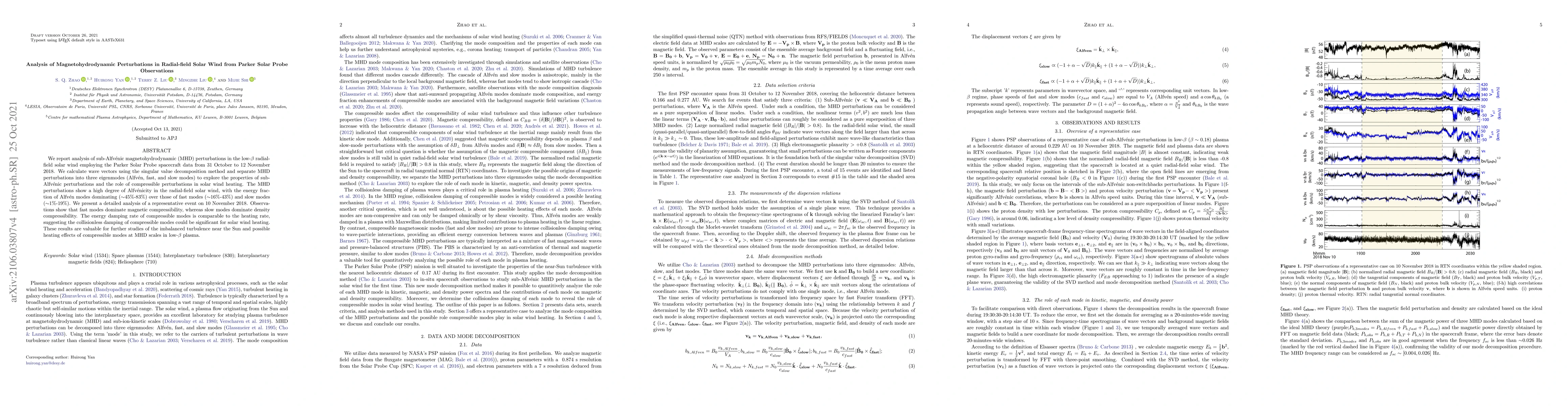 This paper analyzes magnetohydrodynamic (MHD) perturbations in the solar wind using Parker Solar Probe data, identifying Alfv\'en modes as dominant. It finds that Alfv\'en modes contribute significantly to the energy fraction, while fast modes dominate magnetic compressibility and slow modes density compressibility, suggesting their role in solar wind heating.