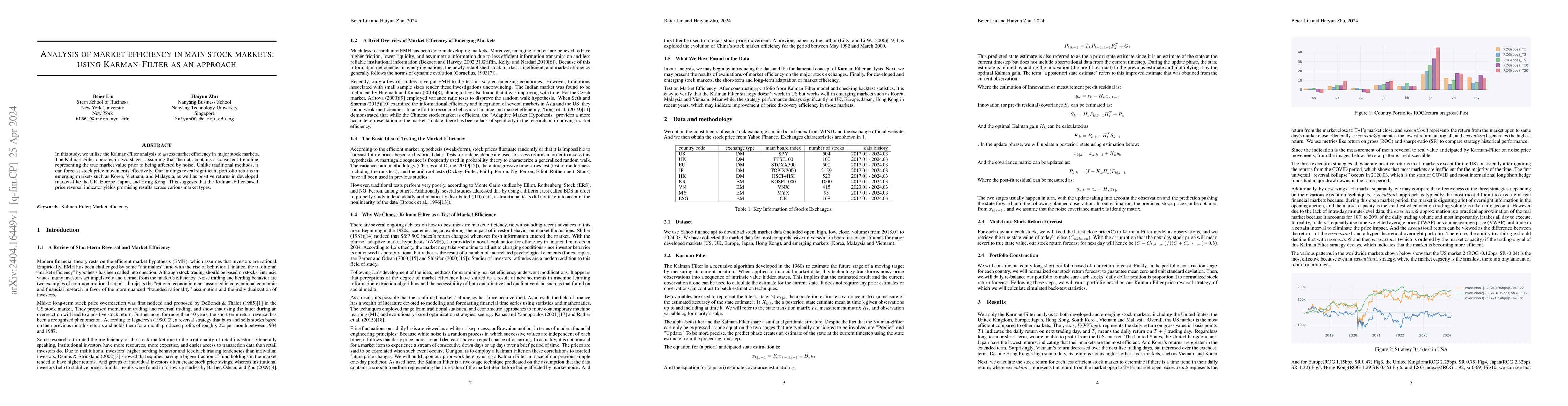 In this study, we utilize the Kalman-Filter analysis to assess market efficiency in major stock markets. The Kalman-Filter operates in two stages, assuming that the data contains a consistent trendline representing the true market value prior to being affected by noise. Unlike traditional methods, it can forecast stock price movements effectively. Our findings reveal significant portfolio returns in emerging markets such as Korea, Vietnam, and Malaysia, as well as positive returns in developed markets like the UK, Europe, Japan, and Hong Kong. This suggests that the Kalman-Filter-based price reversal indicator yields promising results across various market types.