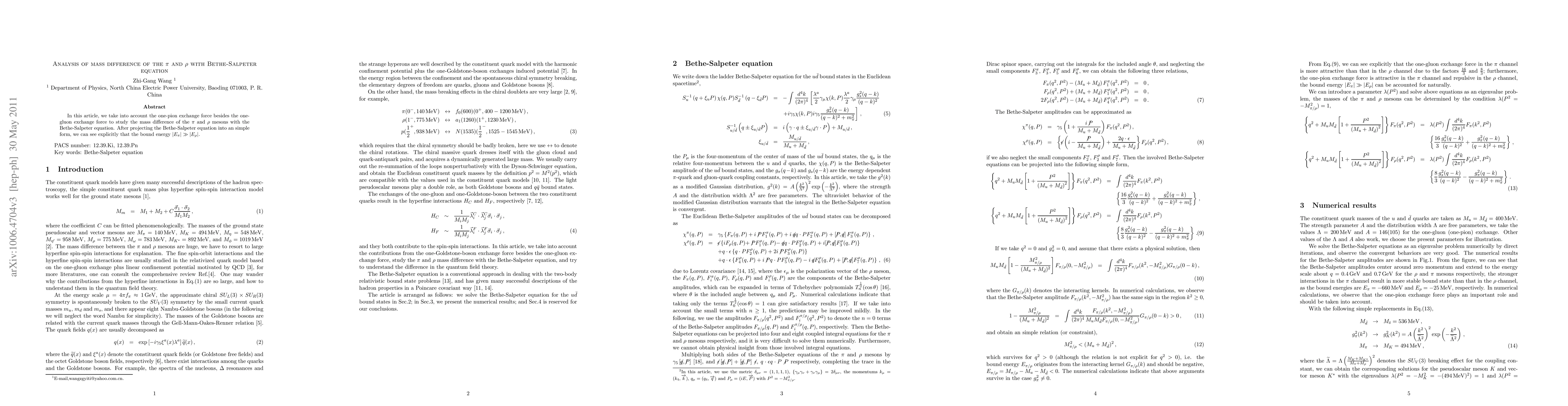 This paper analyzes the mass difference between $\pi$ and $\rho$ mesons using the Bethe-Salpeter equation, incorporating both one-pion and one-gluon exchange forces. The study reveals that the bound energy of $\pi$ mesons ($|E_\pi|$) is significantly greater than that of $\rho$ mesons ($|E_\rho|$).