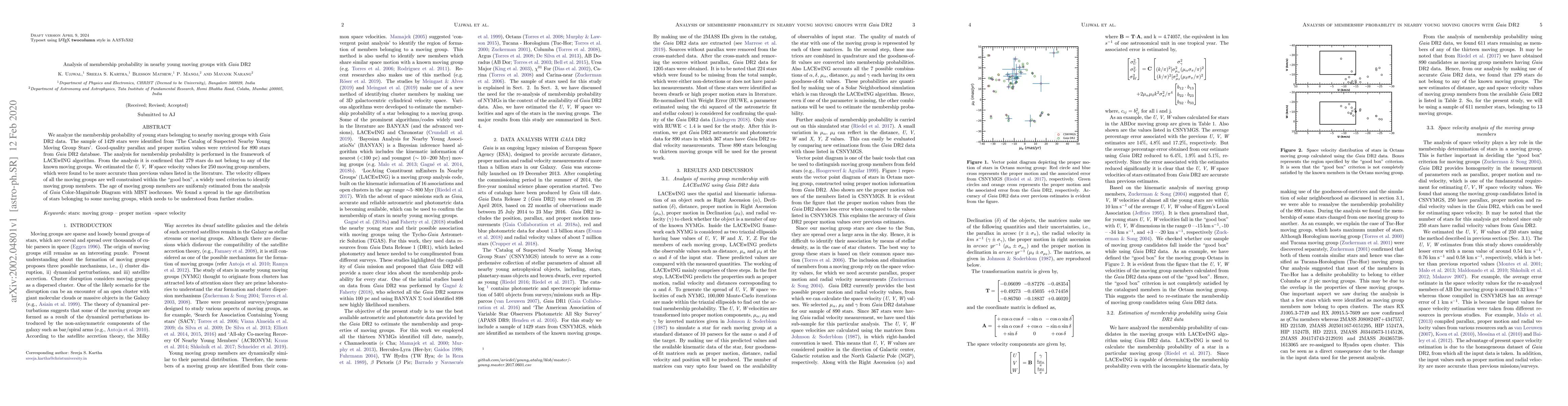 We analyze the membership probability of young stars belonging to nearby moving groups with $\textit{Gaia}$ DR2 data. The sample of 1429 stars were identified from 'The Catalog of Suspected Nearby Young Moving Group Stars'. Good-quality parallax and proper motion values were retrieved for 890 stars from $\textit{Gaia}$ DR2 database. The analysis for membership probability is performed in the framework of LACEwING algorithm. From the analysis it is confirmed that 279 stars do not belong to any of the known moving groups. We estimated the $\textit{ U, V, W}$ space velocity values for 250 moving group members, which were found to be more accurate than previous values listed in the literature. The velocity ellipses of all the moving groups are well constrained within the "good box", a widely used criterion to identify moving group members. The age of moving group members are uniformly estimated from the analysis of $\textit{Gaia}$ Color-Magnitude Diagram with MIST isochrones. We found a spread in the age distribution of stars belonging to some moving groups, which needs to be understood from further studies.