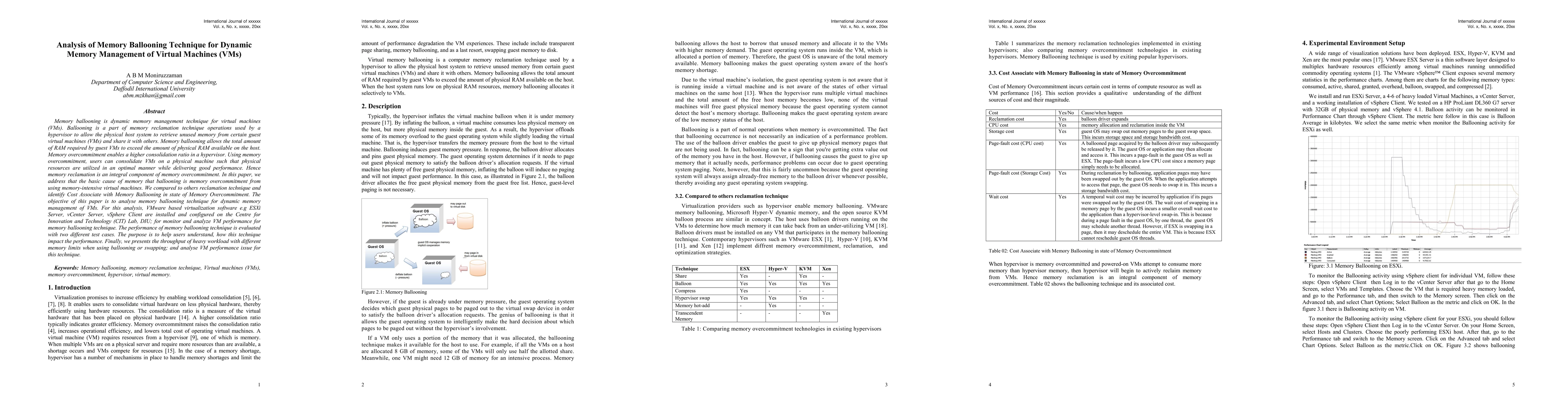 This paper analyzes memory ballooning technique for dynamic memory management of virtual machines (VMs), evaluating its performance impact on heavy workloads and identifying key findings on cost associated with memory overcommitment.