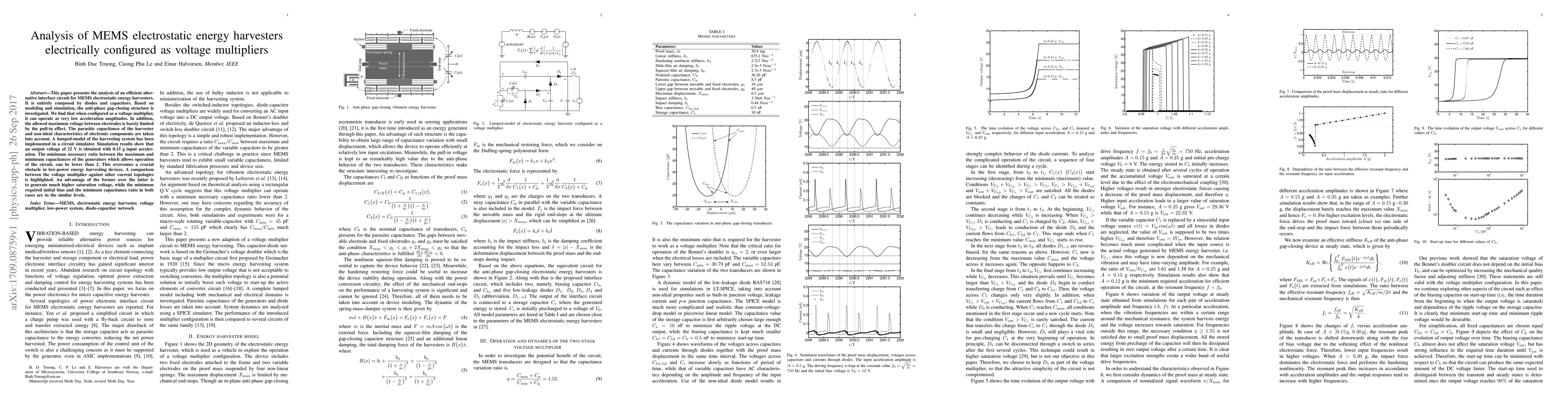 A novel interface circuit for MEMS electrostatic energy harvesters is proposed, which can operate efficiently at low acceleration amplitudes and generate high output voltages.